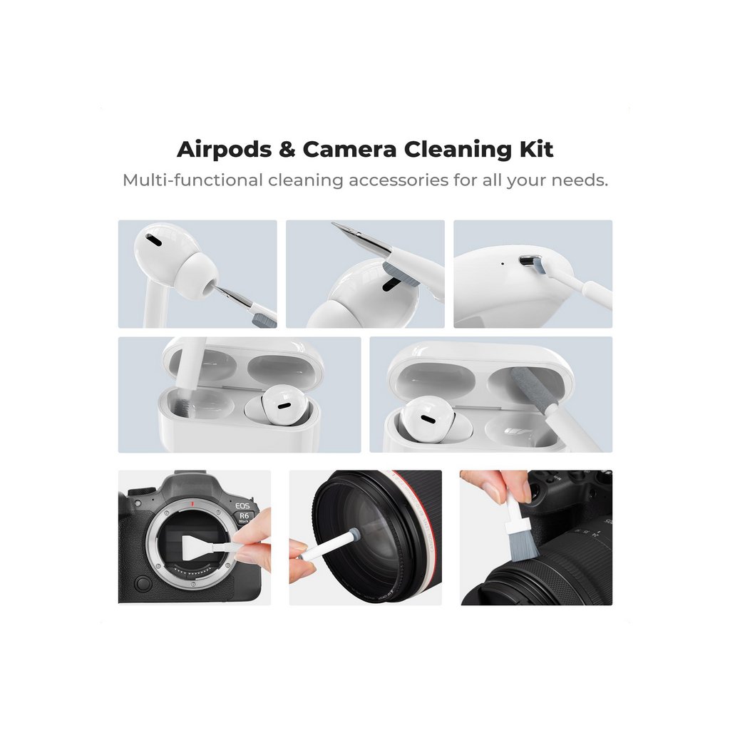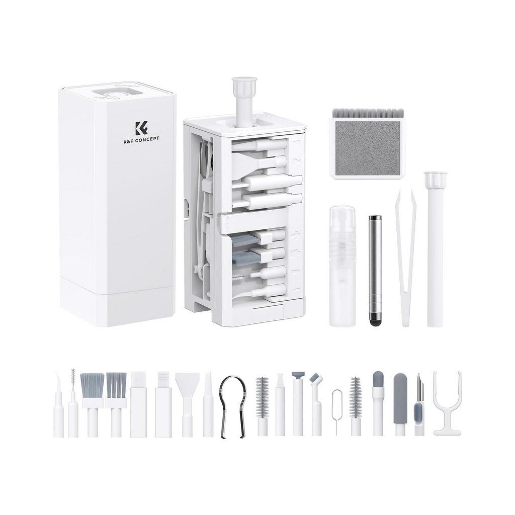 Tackle every nook and cranny of your tech with the K&F Concept 32-in-1 Keyboard Cleaner Kit, a versatile all-in-one solution designed for hassle-free maintenance of keyboards, smartphones, headphones, laptops, and beyond. This compact kit features a retractable big brush as its centerpiece, paired with specialized tools like angled tips for charging ports and speakers, silicone cleaners for Lightning and USB-C ports, a SIM card ejector, and a stylus pen for precise screen interaction. Clean stubborn headphone grime with the dual-ended cleaning pen (metal tip for tough spots, mini brush for meshes), round sponge for charging case interiors, and soft brushes for dust removal—all enhanced by an extendable handle for hard-to-reach areas. For keyboards, the high-density brush sweeps surface dust, while keycap and switch pullers enable easy disassembly for mechanical setups; add the hard bristle brush and tweezers for thorough deep cleans. A 5ml spray bottle (empty, ready for your solution) pairs with fiber cloths to banish fingerprints and oils from screens on phones, tablets, or monitors. The ergonomic main body doubles as secure storage for SD/SIM cards, keeping everything organized and portable. Built for daily use across small electronics, this kit ensures streak-free, damage-free results with durable, integrated tools that fit any cleaning challenge.