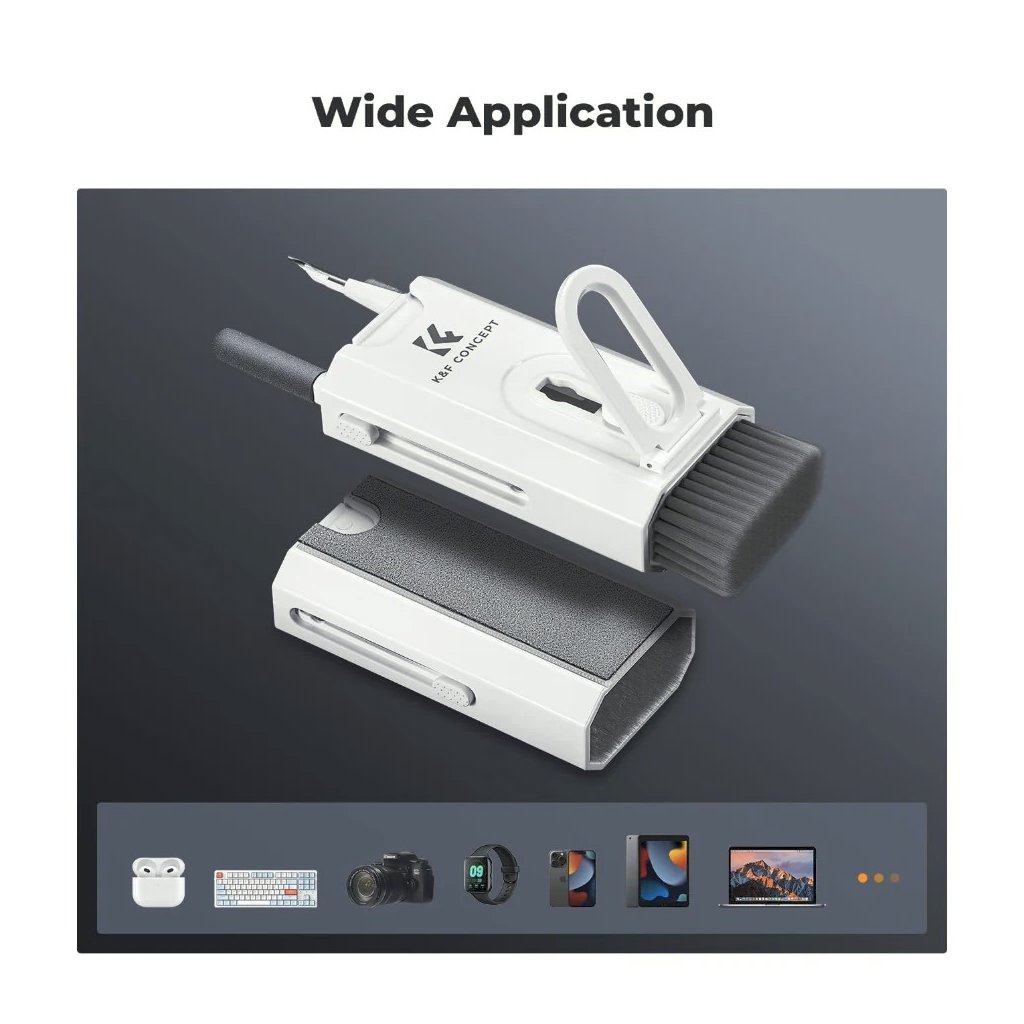 Keep your devices spotless with the K&F Concept 8-in-1 Cleaning Kit. This portable, multi-functional kit includes all the essential tools to clean keyboards, smartphones, computers, headphones, and more safely and effectively.