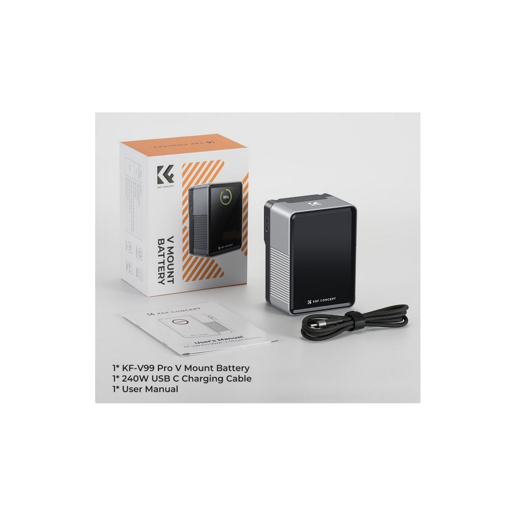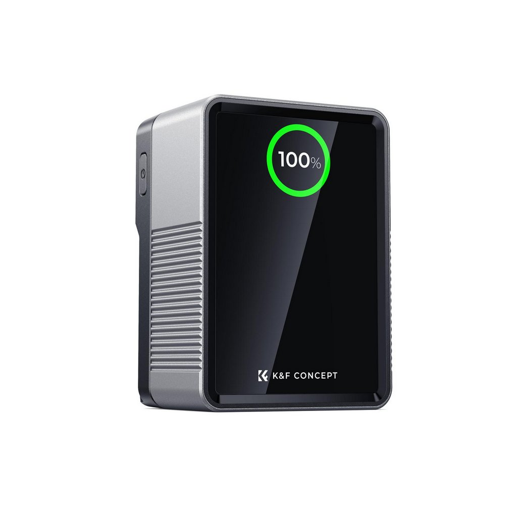 The K&F Concept 99Wh Pro Mini V Mount Battery is an essential power solution for photographers and videographers on the move. With a 99Wh capacity and 6700mAh at 14.8V, it is air travel-friendly, meeting carry-on regulations. Equipped with advanced 100W PD USB-C technology, this battery ensures fast recharging and the ability to efficiently power laptops, smartphones, and other devices. Its extensive connectivity options include two USB-C ports, one USB-A port, one DC port (12V, 5.5x2.5mm), BP, and D-TAP ports, making it a versatile power hub. The real-time TFT color display provides clear monitoring of output power and battery status. Built with durable aluminum alloy and fire-resistant PC, it also features an emergency night light for convenience in low-light conditions, ensuring reliability in demanding environments.