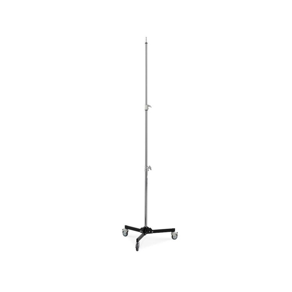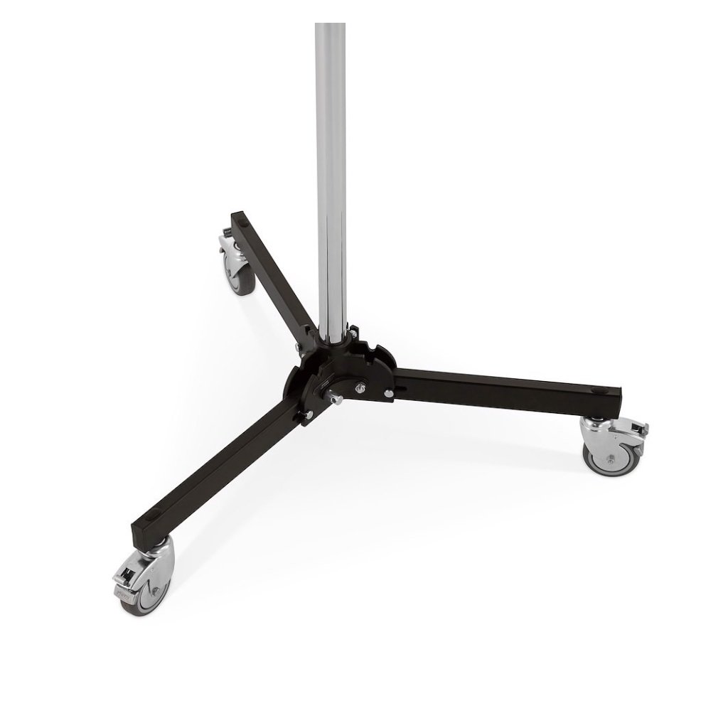 This stand has a folding wheel base and when the stand is retracted and the wheels are folded it is only 98 cm/38.6 in long. The 16 mm/ 5/8 in baby pin allows for easy connection to any fixture, grip head or baby receiver.