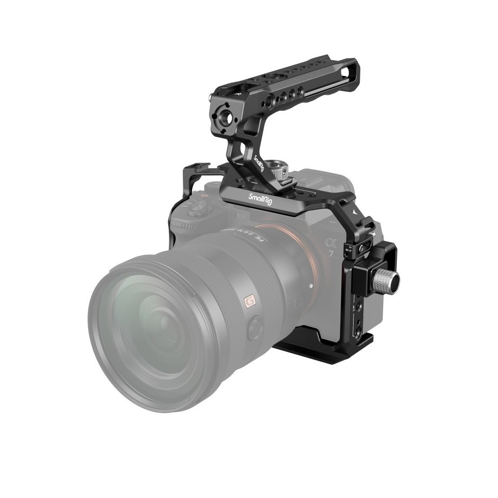 SmallRig Cage Kit for Sony Alpha 7R V / 7 IV / 7S III / 7 V 3668B is designed to facilitate low-angle shots and protect the camera while offering a wide range of accessory mounts. It includes a cage, an HDMI cable clamp, and a top handle. The top handle feels comfortable and enables easy carrying at the low-angle shot.