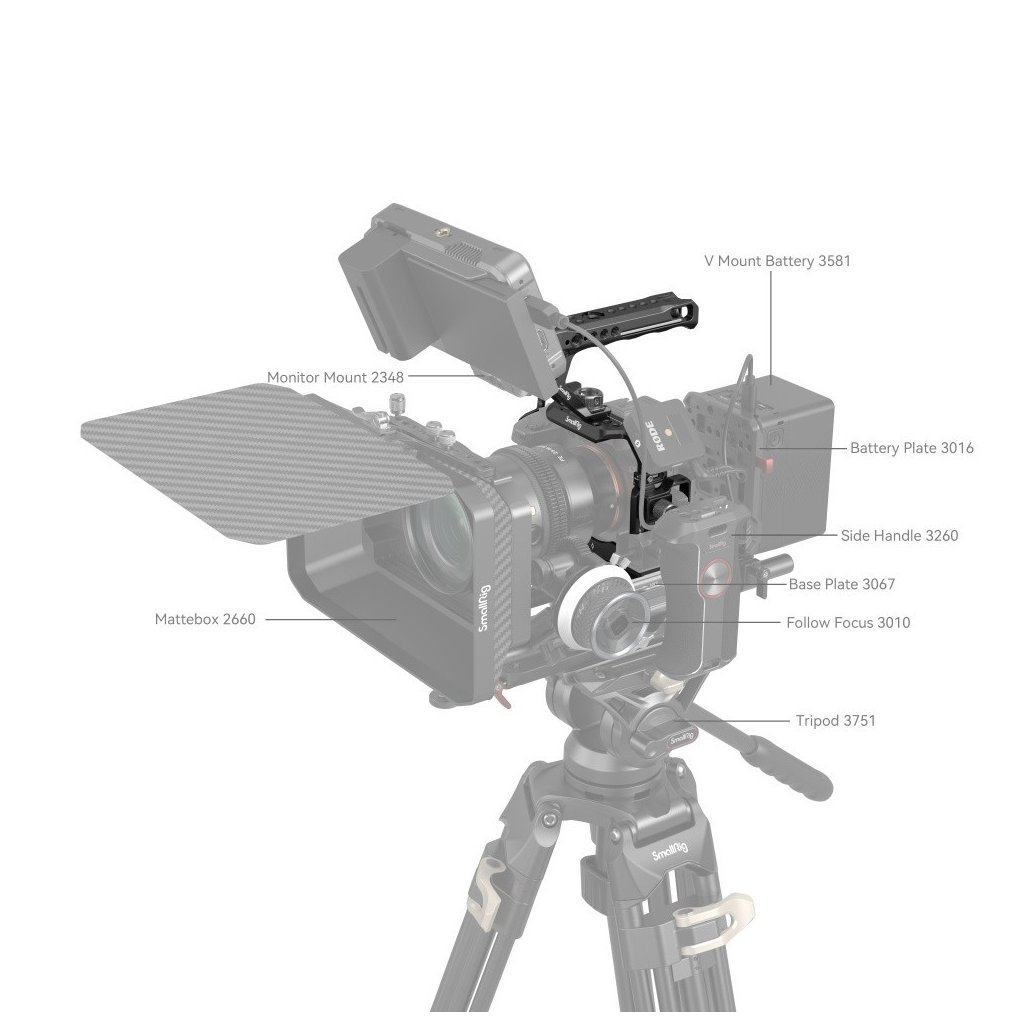 SmallRig Cage Kit for Sony Alpha 7R V / 7 IV / 7S III / 7 V 3668B is designed to facilitate low-angle shots and protect the camera while offering a wide range of accessory mounts. It includes a cage, an HDMI cable clamp, and a top handle. The top handle feels comfortable and enables easy carrying at the low-angle shot. 1/4"-20 threaded holes, ARRI 3/8" -16 locating holes, cold shoes and NATO rails and QD socket support monitor mount 2294, microphones, LED lights, monitor mount 2903B, NATO accessories. The HDMI cable clamp, mounted onto the left side of the cage via one 1/4"-20 screw and two locating pins, prevents deflection and fixes cables with a thumbscrew to protect interfaces and ensure stable signal transmission. In addition, holes on both sides of the cage allow for attaching hand straps. The cage comes with a built-in magnetic flat-head screwdriver & hex spanner for easy disassembly and assembly.