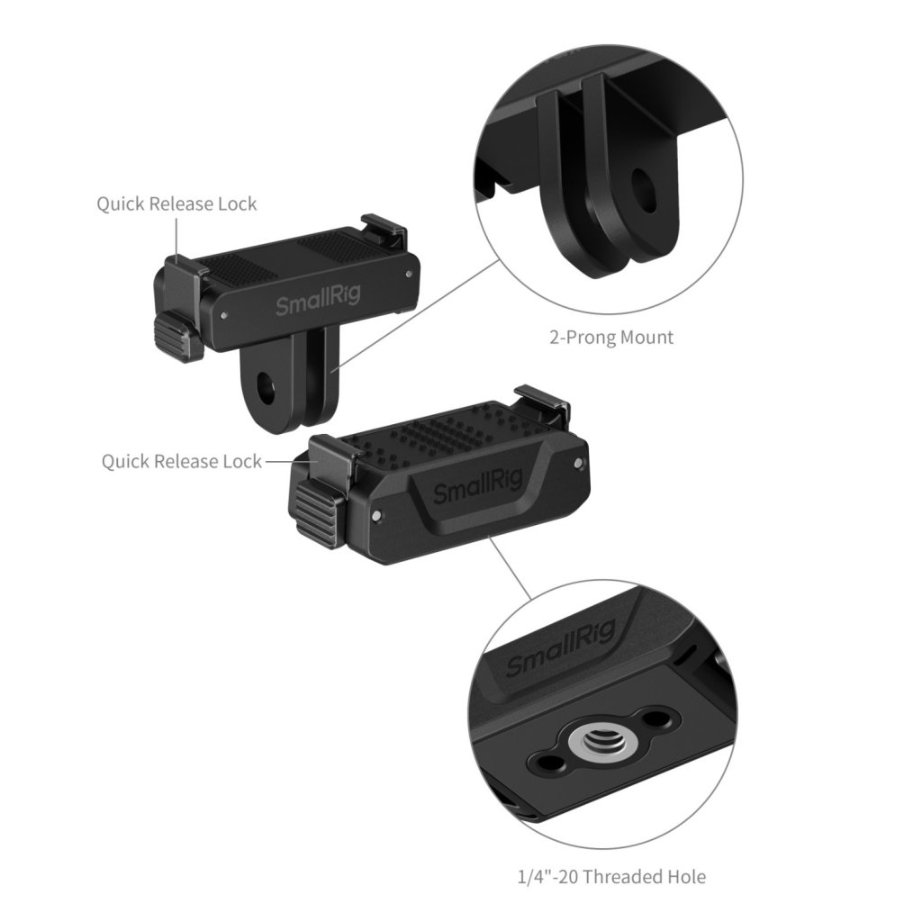 SmallRig Bidirectional Quick Release Folding Adapter Support with 2-Prong Mount and 1/4"-20 Threaded Hole 5918 delivers a secure, stable, and quick release mounting solution for professional photographers and videographers. The innovative spring-loaded clamp mechanism enables instant device mounting and dismounting with just a simple squeeze - streamlining workflow efficiency for multi-camera setups.