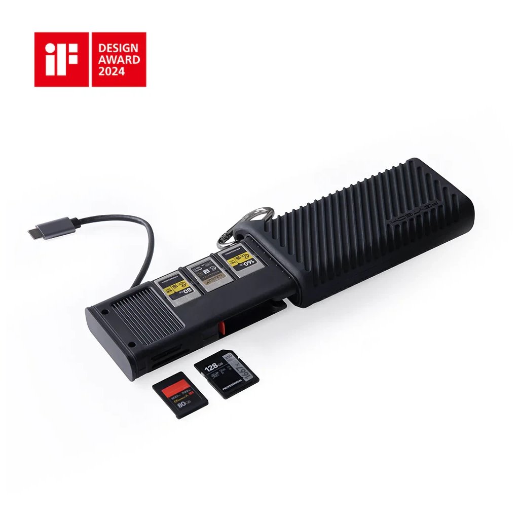 The reader has a built-in USB-C 3.2 Gen 2 cable and USB-C port for power (5V/2A), ensuring stable and reliable data transfer. With IP54 protection, it is protected against dust and splashing water, making it a great helper when shooting outdoors. It works with Windows 7 and newer, macOS 10.6+, Linux, Android, and iPadOS.