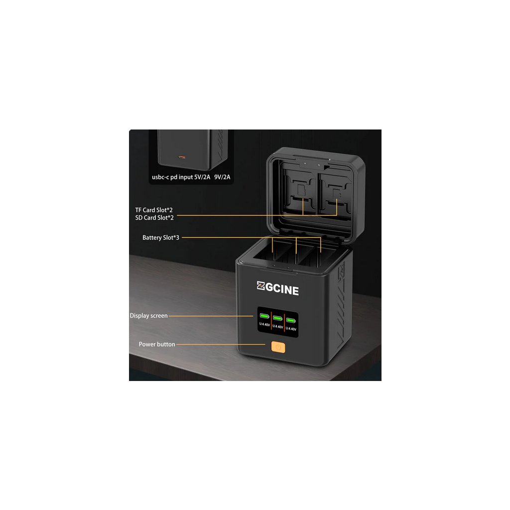 The ZGCINE Charging Case for GoPro 13 is a multi-functional accessory designed to charge up to three GoPro 13 batteries simultaneously. It features an integrated memory card storage system with slots for two SD and two TF cards, as well as a 0.96-inch OLED screen to monitor charging status, making it an all-in-one portable power and media storage solution.