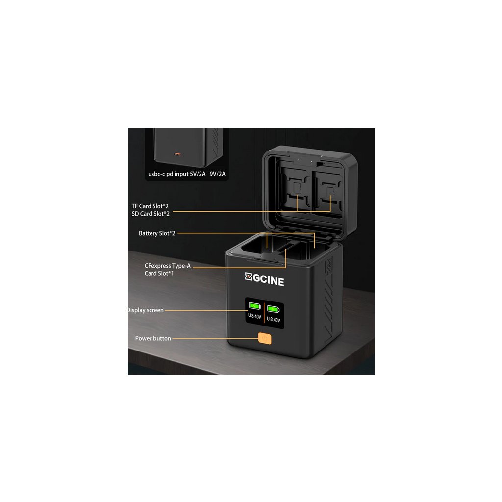 The ZGCINE Charging Case for Panasonic LUMIX DMW-BLK22 Battery is designed for photographers and videographers who need a reliable and portable power solution. Featuring dual USB-C PD input and output, this charging case ensures fast and efficient battery recharging. It also includes SD, TF, and CFE Type-B card slots for convenient storage and organization of media files. The 0.96-inch OLED screen displays real-time charging status, enhancing usability.