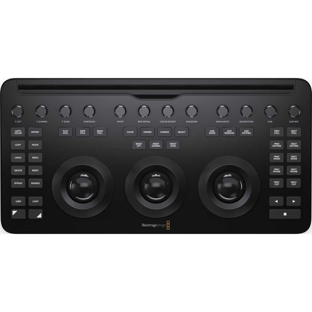 The new DaVinci Resolve Micro Color Panel features 3 high resolution weighted trackballs and 12 precision machined control knobs which give direct access to the most powerful primary correction features, making it easy to experiment and try new combinations. The primary knobs can be used to control Y Lift, Y Gamma, Y Gain, Contrast, Pivot, Mid-tone Detail, Color Boost, Shadow, Highlight, Saturation, Hue Rotation and Luminance Mix.