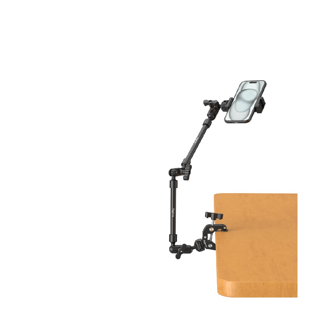 SmallRig Desktop Shooting Magic Arm with Crab Clamp Kit 4766 offers a comprehensive shooting solution for users working with lightweight devices such as smartphones, webcams, and action cameras. The kit includes a 56cm (22in) adjustable magic arm, a crab clamp, a phone holder, and a 1/4”-20 to 3/8”-16 thread adapter. The adjustable magic arm attaches to the crab clamp with an anti-deflection 1/4”-20 threaded screw, ensuring a secure link between the clamp and the arm. The crab clamp extends up to 50.0cm / 19.7in, adapting to various surfaces and objects within its range, while silicone pads at the swivel tips provide a secure grip without damaging the surfaces.