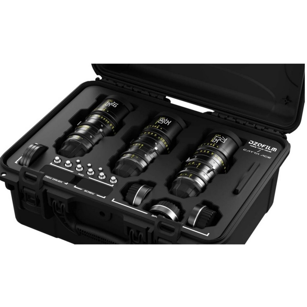 The compact zoom lenses deliver cinema-quality image and natural skin tones. The parfocal design ensures consistent sharpness when zooming. Focus breathing and image shift are significantly reduced. The DZOFILM Catta Ace Zoom Bundle comes in a sturdy hard shell case.