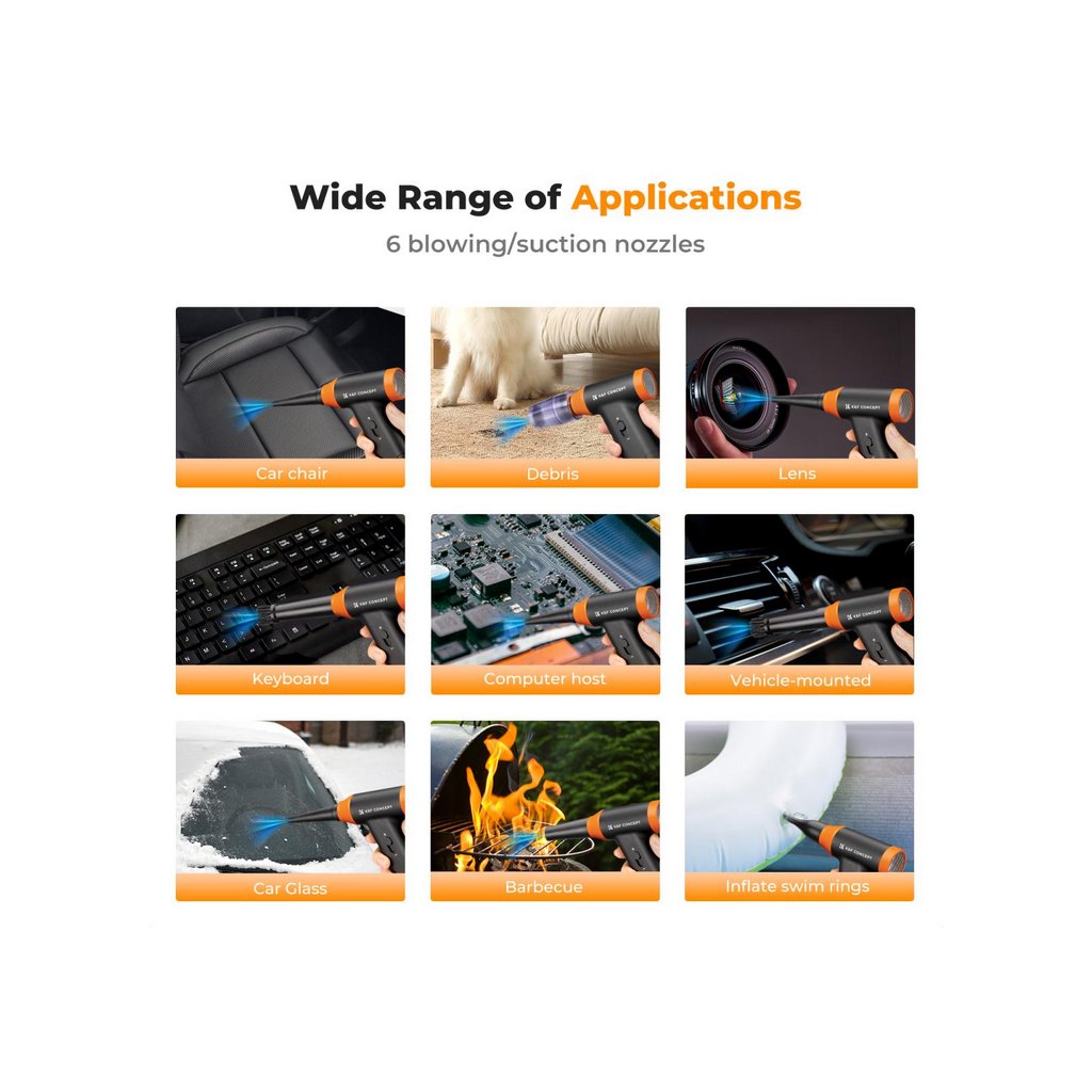 - Multi-Purpose Design: With six nozzle and brush attachments and five vacuum cleaning cloths, it caters to a variety of cleaning scenarios—from computers, laptops, and car interiors to outdoor activities like blowing fire for picnics, inflating swimming rings, or drying hair.