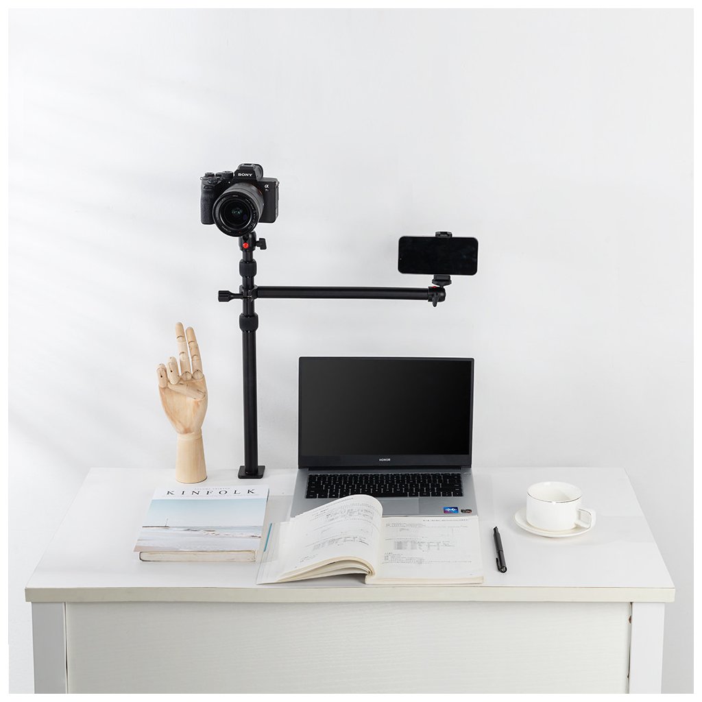 SmallRig Encore DT-30 Desk Mount with Holding Arm 3992 is mostly used for photography, videography, live streaming, vlog shooting, makeup, selfie, etc. Made of strong, durable aluminum alloy, the anti-rust stand features easy-to-clean, anti-fingerprint frosted surface. Designed with 3 extension rods that can extend up to 1m of working height. The mount is anodized and CNC machined, and also comes with a 360° rotating removable ball head (Φ22mm) and bears a load of 3-10KG. The 1/4" screw on the top ensures a 360° swivel for panorama shooting and -90°/+45° tilt for multi-angle shooting without disassembling the devices. This mount fits up to 5cm / 2" thick desks, making it more space-saving than a light stand. Its 355mm long aluminum alloy holding arm, with a load capacity of 2KG, has a Φ18mm ball head and a 1/4" screw on the top for attaching LED light, microphone, smartphone, etc.; the attached ring light adaptor perfectly works with DSLR camera, smartphone, ring light, panel light, etc.