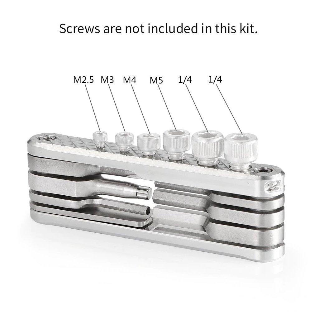 SmallRig Folding Tool Set with Screwdrivers and Wrenches 2213 is a pocket-sized folding multitool designed for video photographers. It is compact and easy to be carried around, preventing loss of tiny wrenches and screwdrivers. The wrenches and screwdrivers are made of solid stainless steel, and the side plates are made of robust aluminum alloy. It comes with 4 Allen Wrenches 2.5, 3, 4, 3/16, 1 slotted screwdriver, 1 Phillips screwdriver and 1 Torx T25 driver, covering the needs of most shooting scenarios. Besides, there are additional threaded holes M2.5, M3, M4, M5, 1/4 on the side for storing spare screws.