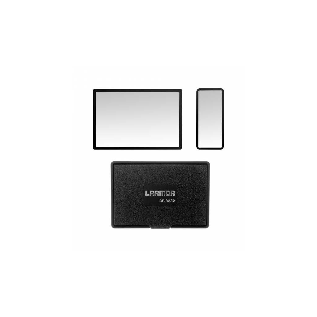 The GGS Larmor GEN5 is a unique set consisting of a protective cover to protect your camera's LCD display from damage and a sunshade to allow you to preview your images even on the sunniest day.The GGS Larmor GEN5 protective shield is made up of five layers of materials to provide the ultimate protection for your display from damage, scratches, impact and dirt. The outer layer, using the latest discoveries in nanotechnology, minimises fingerprint marks, ensuring the cover's clarity and comfort. Japanese high hardness toughened optical glass forms the main protective element of the cover. Its parameters enable effective protection with a thickness of just 0.3 mm. The small dimensions and low weight also allow the cover to be used with cameras equipped with a movable display. Metal frame The metal frame forms the backbone of the cover, significantly increases the strength of the corners and enables the fitting of a GGS sunshield. A splinter protection layer protects the display and the user's hands from glass shards in the event of the shield being broken. A layer of highly adhesive silicone allows easy installation, without the need for any tools or adhesives. In addition to the cover for the main camera display, the kit also includes a cover for the top display.The covers are compatible with the displays of Canon 5D Mark IV cameras. They do not restrict the usable surface area of the screens and retain the functionality of touch control (if this functionality is offered by the camera).The GGS CF-3232 sunshield allows you to use the main display even on a very sunny day. The shadow it casts significantly improves the comfort of working with the camera's display, including live image viewing and menu navigation. The lightweight, foldable design makes the accessory extremely handy and easy to transport, and the built-in magnets allow quick mounting and removal on Larmor GEN5 protective covers. Specification construction: 5 layers Surface hardness: 9H thickness of glass layer: 0.3 mm light transmission: greater than 95% method of fitting the protective cover: silicone adhesive layer (adhesive-free fitting) mounting system for sun visor: magnets integrated into the visor and compatible with GGS Larmor GEN5 sun visors colour: black Compatibility shield: Canon 5D Mark IV cameras shields: GGS Larmor GEN5 protective covers designed for cameras: Canon 1DX, 1DX Mark II, 5D Mark III, 5D Mark IV, 5DS, 5DS R, Fujifilm X-T1, X-T2, X-A3 Kit contents Camera main screen protector Camera top screen protector Sun shield CF-3232 Sun shield CF-3232 A saturated cloth to clean the screen before mountingDodatočné parametre