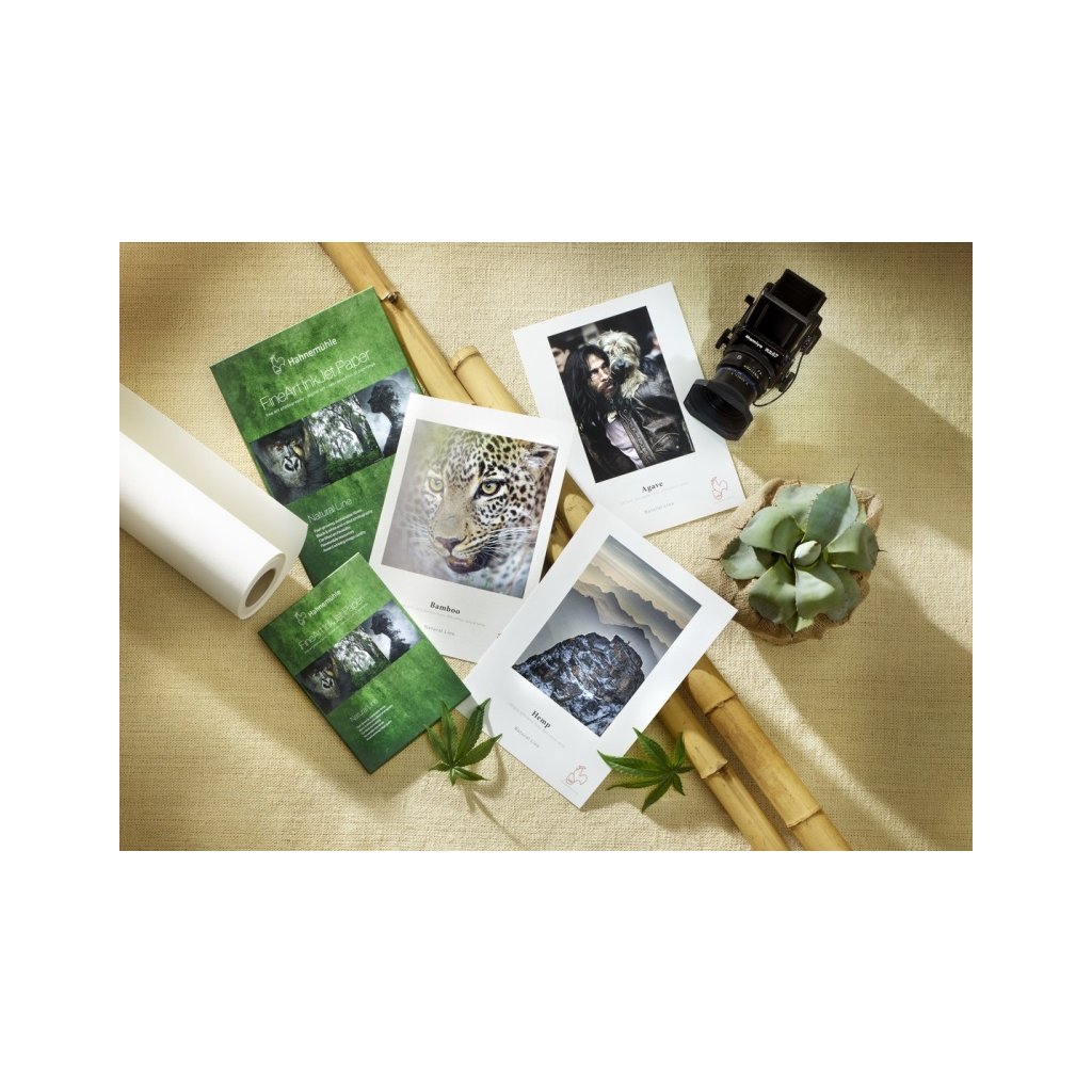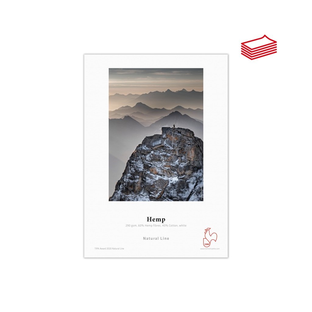 FineArt papier z konope Umelecký papier Hahnemühle Hemp používa jedno z najstarších a najrozmanitejších prírodných vlákien na svete: zo 60% je vyrobený z konopných vlákien. Hoci tento FineArt inkjet papier neobsahuje optické zjasňovače, ľahko vás zaujme svojím jasne bielym, prírodným tónom. Ľahko textúrovaný povrch dodáva papieru príjemný, hodvábny pocit. Vďaka matnému prémiovému povrchu môžeme hovoriť o skutočne univerzálnom papieri. Skvelá reprodukcia farieb a detailov, vynikajúca hĺbka čiernej, kontrasty s ohromujúcim efektom - to všetko vám papier Hahnemühle Hemp umožnia. Neobsahuje kyseliny a ligníny a spĺňa aj tie najnáročnejšie požiadavky v rámci dlhovekosti (archivačného potenciálu). Samo konope bolo po stáročia nevyhnutnou súčasťou pri výrobe papiera a vďaka svojim robustným vláknam sa často využívalo pre významné historické dokumenty, ako napríklad na výrobu Gutenbergovej biblie alebo americkej Deklarácie nezávislosti. návody a ICC profily TU zoznam odporúčaných tlačiarní Vlastnosti Hahnemühle Hemp: 290 gsm · 60 % konopné vlákno · 40 % bavlna biely odtieň, bez optických zjasňovačov jemná textúra matný prémiový povrch zaisťujúci mimoriadne výsledky tlače neobsahuje kyseliny a lignín v súlade s ISO 9706 (muzeálna kvalita a stálosť) kompatibilné s pigmentovými a dye-based inkjet tlačiarňami návody a ICC profily dostupné TU obj. kód listy MH641770 Hahnemühle Hemp A2 Archival Box 25 sheets MH641771 Hahnemühle Hemp A3+ Archival Box 25 sheets MH641772 Hahnemühle Hemp A3 Archival Box 25 sheets MH641773 Hahnemühle Hemp A4 Archival Box 25 sheets role MH643580 Hahnemühle Hemp 127.0cm (50") x 12m Roll MH643581 Hahnemühle Hemp 111.8cm (44") x 12m Roll MH643582 Hahnemühle Hemp 91.4cm (36") x 12m Roll MH643583 Hahnemühle Hemp 61.0 (24") x 12m Roll MH643584 Hahnemühle Hemp 43.2cm (17") x 12m Roll MH643585 Hahnemühle Hemp 61.0 (24") x 5m Sample Roll TIPA WORLD AWARDS 2020 „Najlepší inkjet fotopapier“Dodatočné parametre