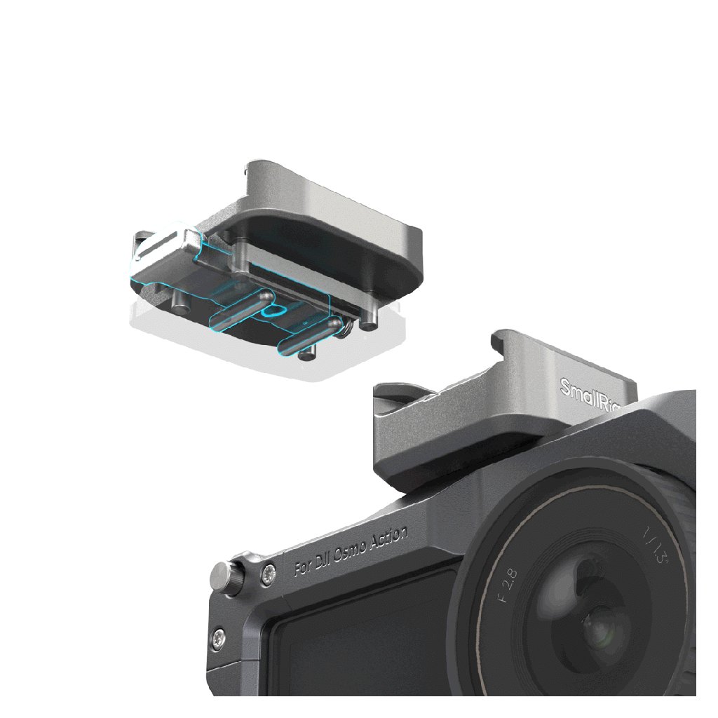 SmallRig HawkLock H18 Quick Release Support with Cold Shoe 4500 consists of a quick-release cold shoe adapter and a quick-release cold shoe baseplate. With one click, the anti-detachment column at the bottom of the quick-release adapter, combined with the groove design on the top of the baseplate, locks the cold shoe in place, effectively preventing it from slipping and ensuring smooth and safe assembly. It can hold up to 800g. The top of the quick-release cold shoe adapter is equipped with silicone pads to avoid scratches on the cold shoe accessories while ensuring a more stable connection and reducing shaking. The adapter can convert ordinary cold shoe accessories (such as LED video light, microphone, etc.) into those featuring quick-release design, making it more efficient and time-saving. The base plate is equipped with spring-loaded locating pins to support SmallRig action camera cages like 4119B, 3084C, 4088B, and various others with locating holes to ensure safety and stability.