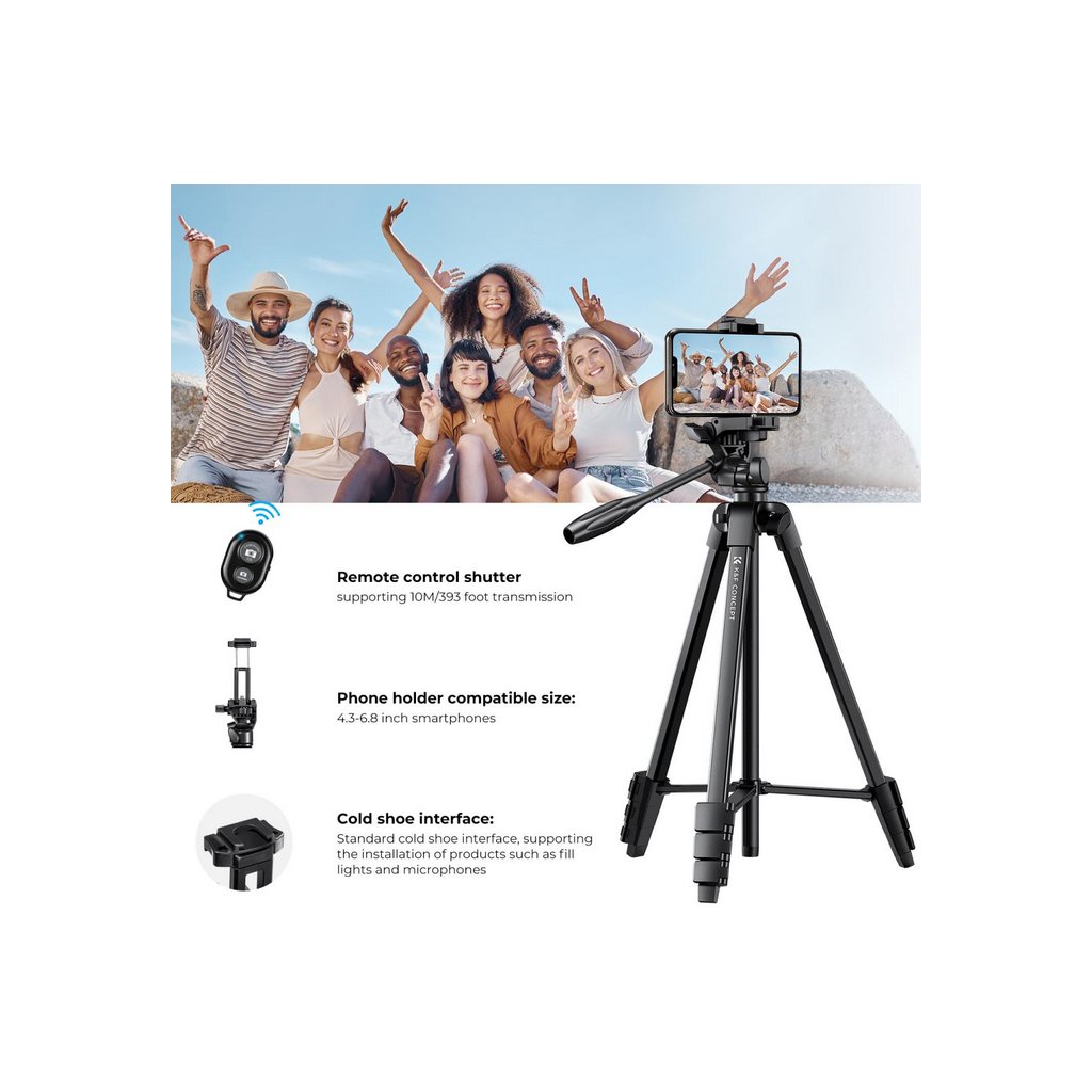 The K&F 59.4''/1.5m Aluminum Travel Tripod is a lightweight and versatile tripod designed for both smartphones and cameras. Weighing only 0.61kg, it features adjustable height (17-60 inches), 360° panoramic shooting, and a compact foldable design (42cm) with a Bluetooth remote, making it perfect for travel and outdoor photography.