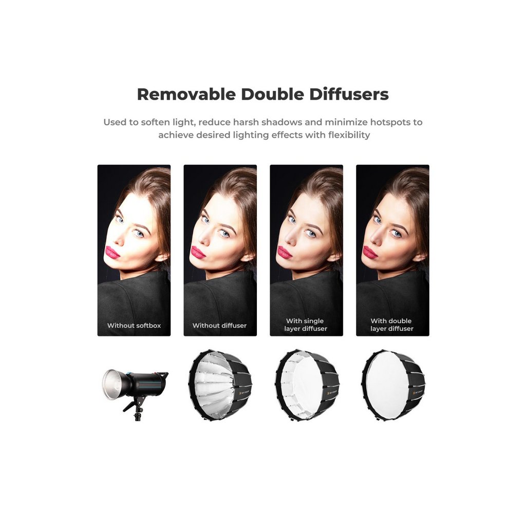 - Honeycomb Grid & Diffusers: The included honeycomb grid allows for concentrated light direction, enhancing the levels of light and dark in your shots. Two high-quality diffusers can be used together or separately to create different lighting effects, perfect for portraits, product photography, beauty and fashion shoots, weddings, corporate headshots, and more.