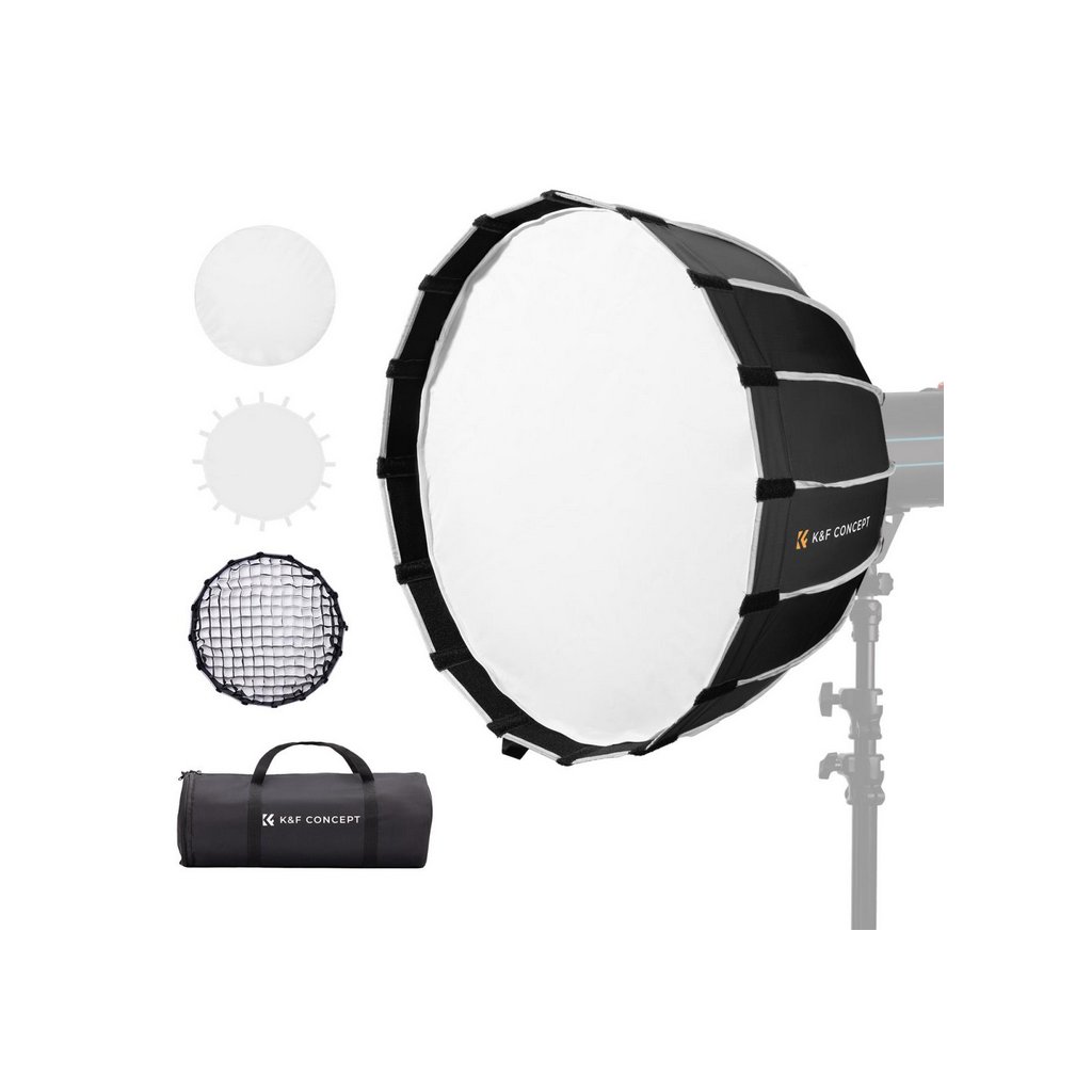 The K&F 90cm Quick Release Hexagonal Parabolic Softbox with Bowens Mount is designed to enhance your photography and videography with its smooth, even light distribution. This deep parabolic softbox softens harsh glare, eliminates unwanted shadows, and maintains true color reproduction. Its quick release and folding alloy chuck structure save time and energy, making it more efficient than traditional softboxes. With 16 durable and elastic ribs, it maintains its impeccable shape and durability even after extensive use. The included honeycomb grid and diffusers allow for precise light control and creative effects, making it ideal for portraits, product photography, beauty and fashion shoots, weddings, and corporate headshots.