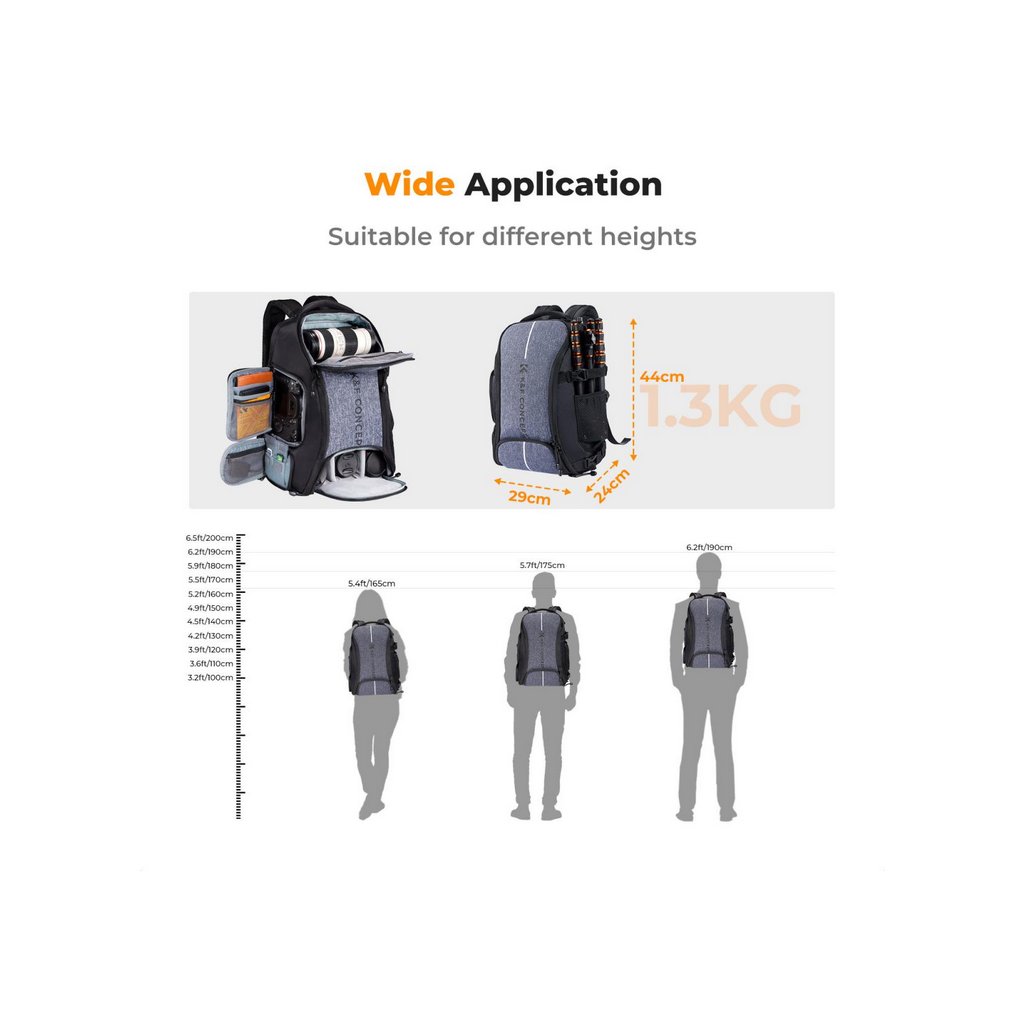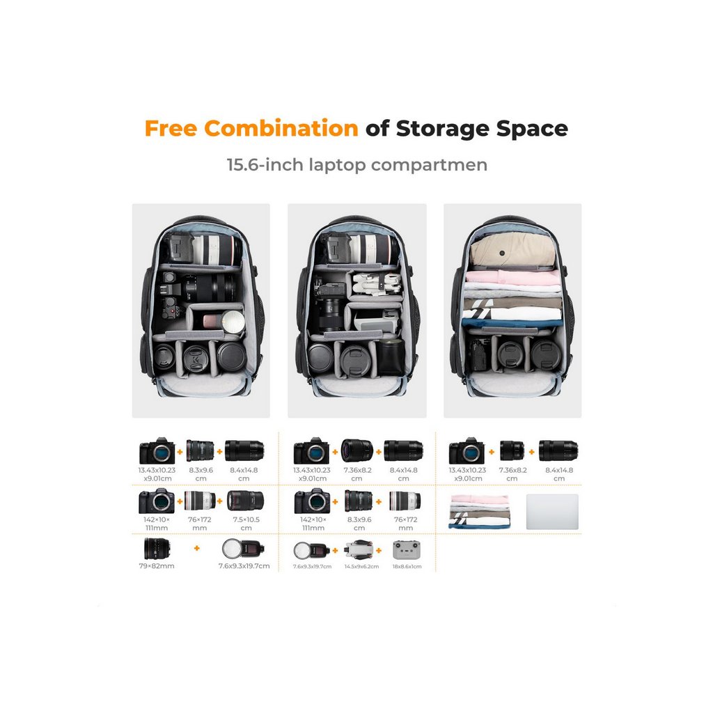The K&F Beta Backpack 25L is a versatile and spacious camera bag designed for photographers on the go. With dimensions of 17.3 x 11.8 x 9.4 inches and a capacity of 25 liters, this backpack offers three-tiered compartmentalization, providing customizable organization for your gear. The upper compartment is suitable for a 200mm lens or a Mavic Air 2 drone, the medium compartment can hold one camera and two standard lenses or two cameras, and the lower compartment is designed for three standard lenses or one camera and one lens. The inner padding is adjustable to fit your specific needs.