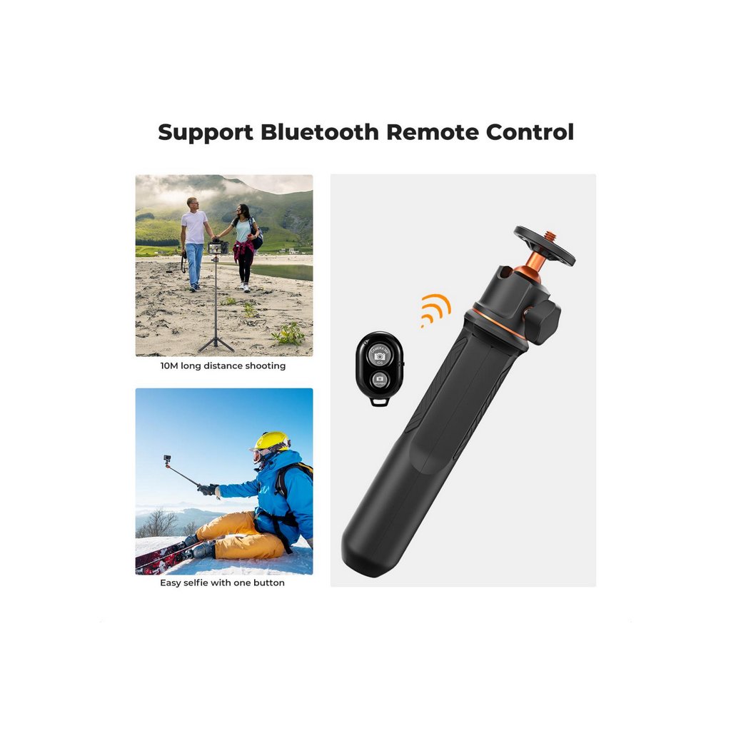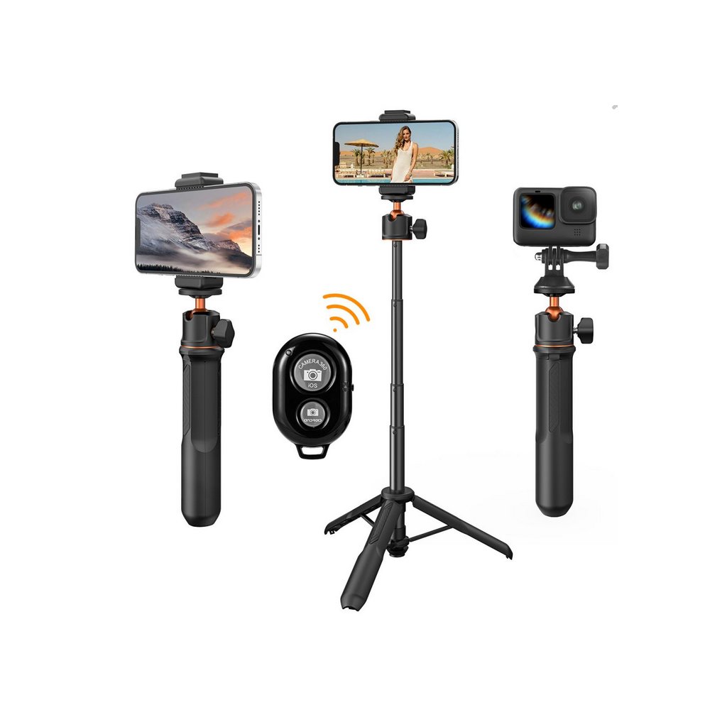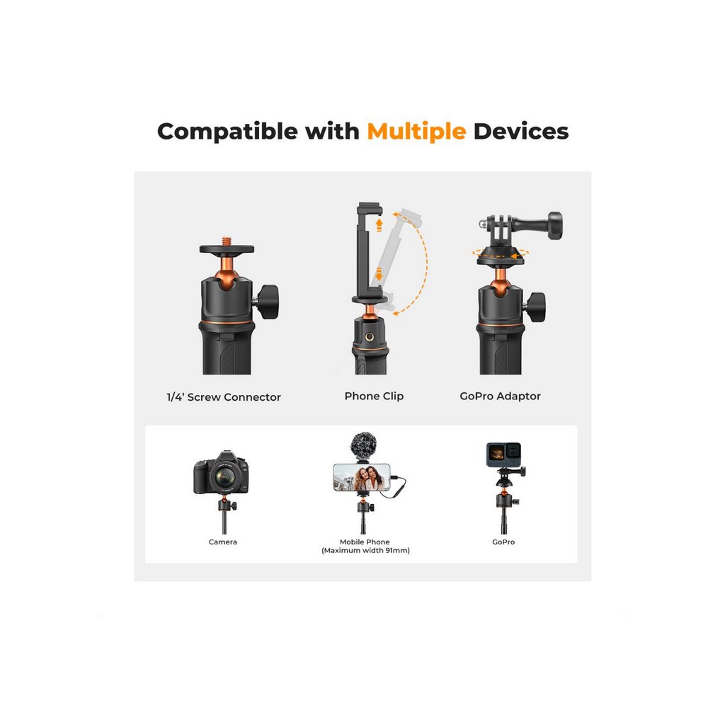 The K&F MS11 Tripod is a versatile and lightweight solution designed for mobile phone and action camera users. It features a mobile phone clamp that supports devices with a maximum width of 91mm, making it ideal for video recording and broadcasting. The included GoPro adapter expands its use to action cameras like GoPro, DJI Osmo Action, and Insta 360 devices. The tripod's top has a 1/4-inch interface, enabling connection to various devices for diverse shooting needs. Its built-in shock-absorbing rubber ring and widened fixed structure ensure stability, while the non-slip silicone pad at the bottom provides secure support. Weighing only 147g, this tripod is highly portable and perfect for travel and outdoor photography. The included Bluetooth remote control pairs quickly without a password and supports photography or video recording within a 10-meter range, with a continuous working time of up to 10 hours.