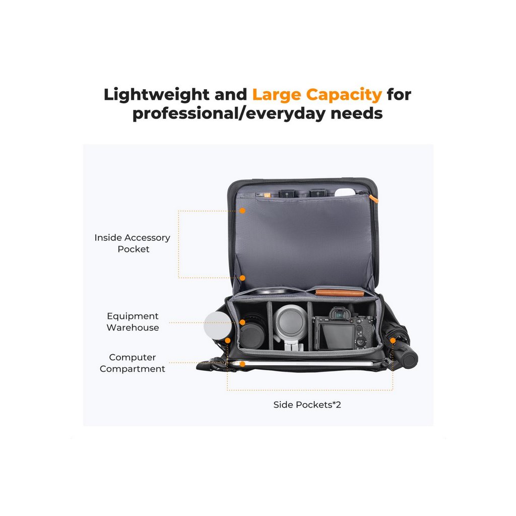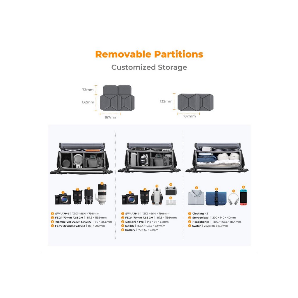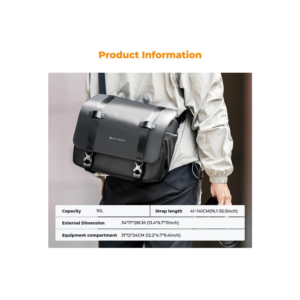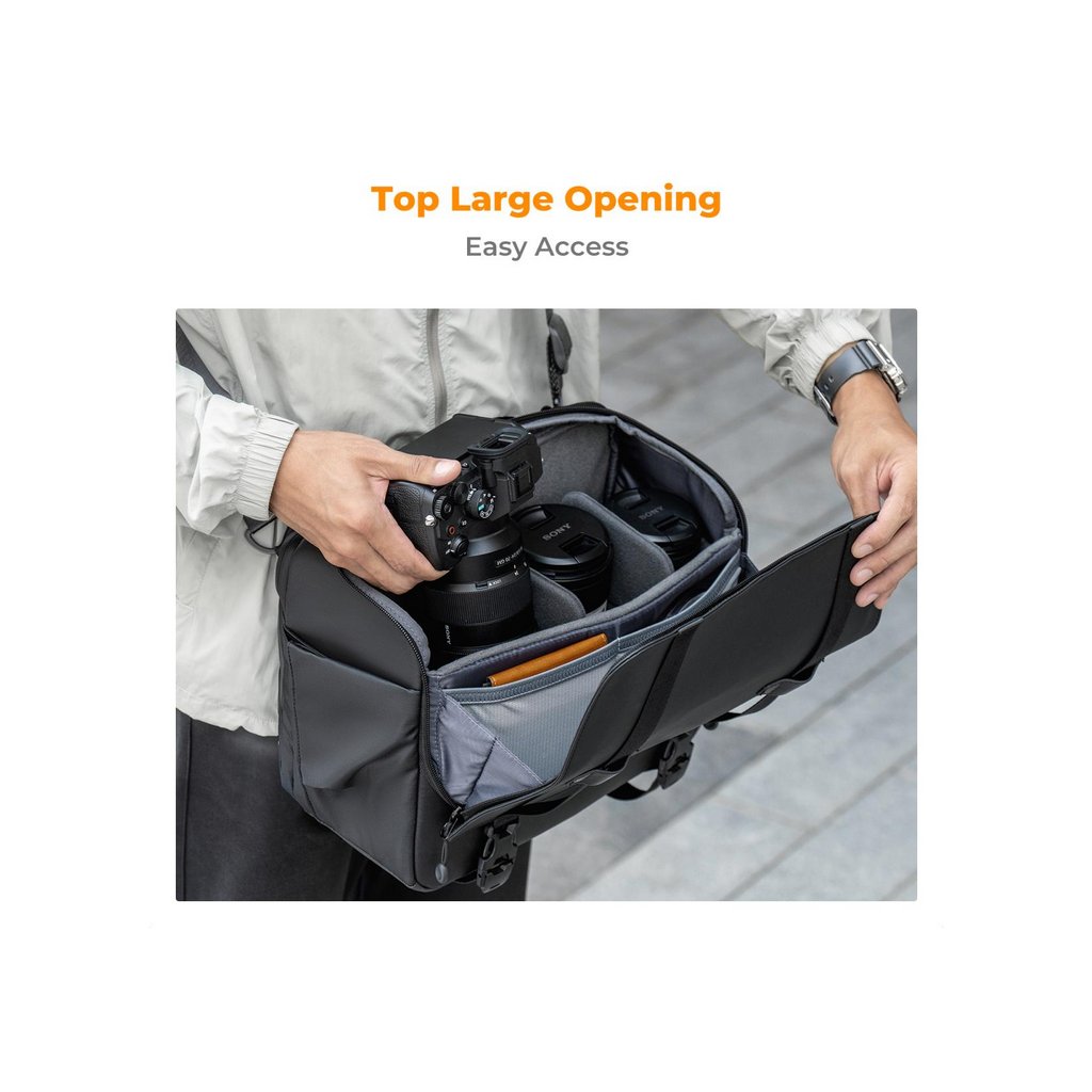 The K&F Sling Bag 10L U10 combines style and functionality with a spacious design, customizable compartments, and multiple accessory pockets. Ideal for carrying camera equipment, devices, and essentials, it also features a pocket for a 13" MacBook Pro and a dedicated space for a small tripod.