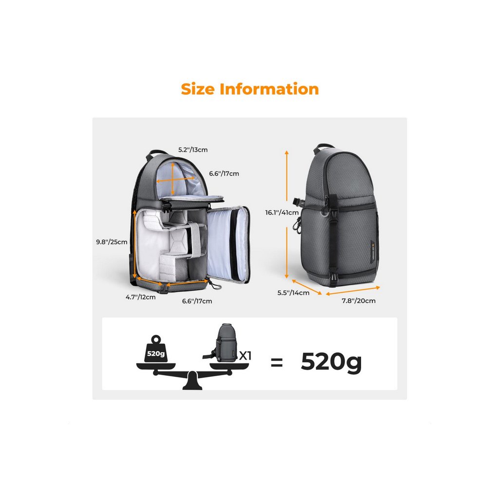 The K&F 10L Urban Wander 02 Sling Bag is a thoughtfully designed camera bag that combines style, practicality, and protection. Measuring 16 x 8 x 6 inches, it provides ample storage space while maintaining a sleek and compact form. The bag is equipped with multiple compartments, allowing you to safely store your camera, lenses, tripod, accessories, and personal items.