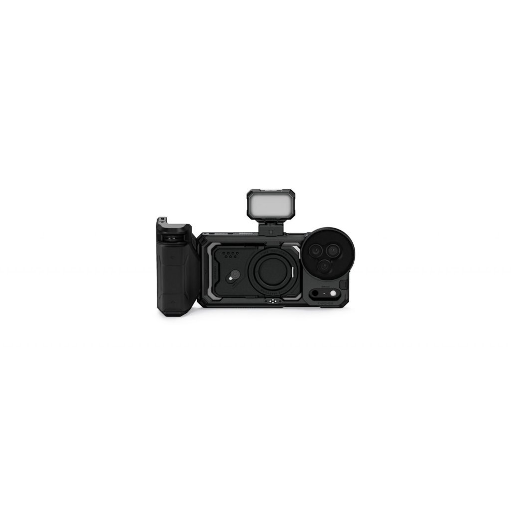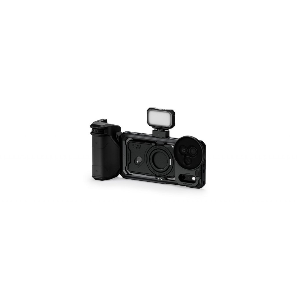 The Tilta Khronos iPhone 17 Pro Max Street Snap Kit in Black is a mobile filmmaking kit designed for the iPhone 17 Pro and Pro Max. It includes a focus PD handle with integrated battery and Bluetooth control, a mini LED panel with adjustable brightness, and a magnetic 58mm polarizer with black mist diffusion filter to reduce glare and enhance colors, all built into a protective, quick-release cage system.