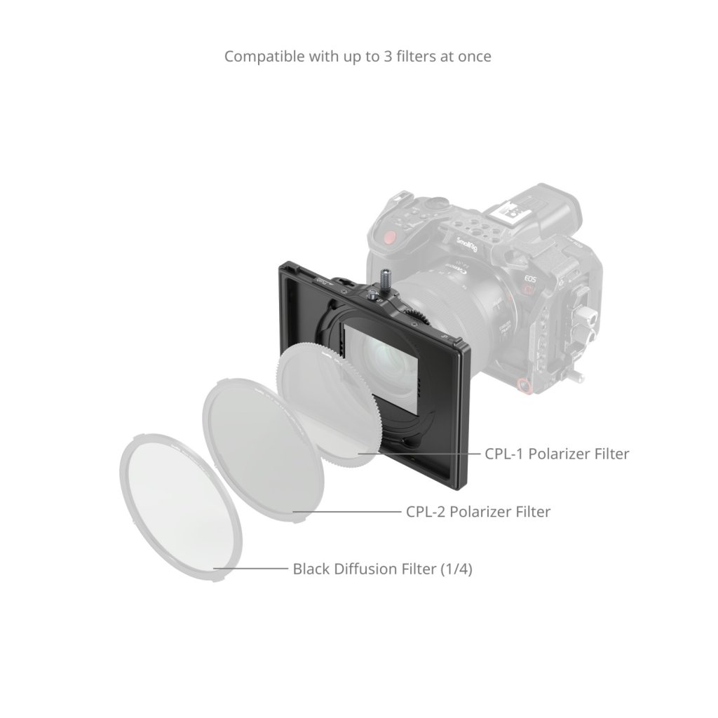 SmallRig LITE Matte Box with Adjustable Mount 4409 is designed for video and photo enthusiasts. The unique adjustable clamp design of the matte box features a three-point locking system, allowing for quick assembly and disassembly by pressing the push rods on both sides of the clamp and a locking knob on top. With an adjustable clamp range of 67.0 - 82.0mm (2.6 - 3.2in), it offers broad compatibility with popular mirrorless and cinema lenses. With its slim design, it accommodates circular and square filters seamlessly, ensuring no vignetting at focal lengths ≥16mm (for full-frame cameras and lenses), reducing glare effectively in challenging conditions. Additionally, you can meet your diverse filter needs for video and photo shoots by selecting from optional CPL, ND (ID:4799), VND (ID:4649), Black Diffusion Filter Kit (ID:4650), and White Diffusion Filter Kit (ID:4652). Boasting a modular design, this matte box facilitates easy accessory assembly and disassembly in a mere 3 steps. Its sleek, lightweight build not only streamlines the process but also alleviates equipment weight, enhancing comfort during shoots.