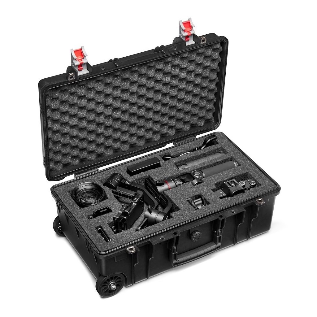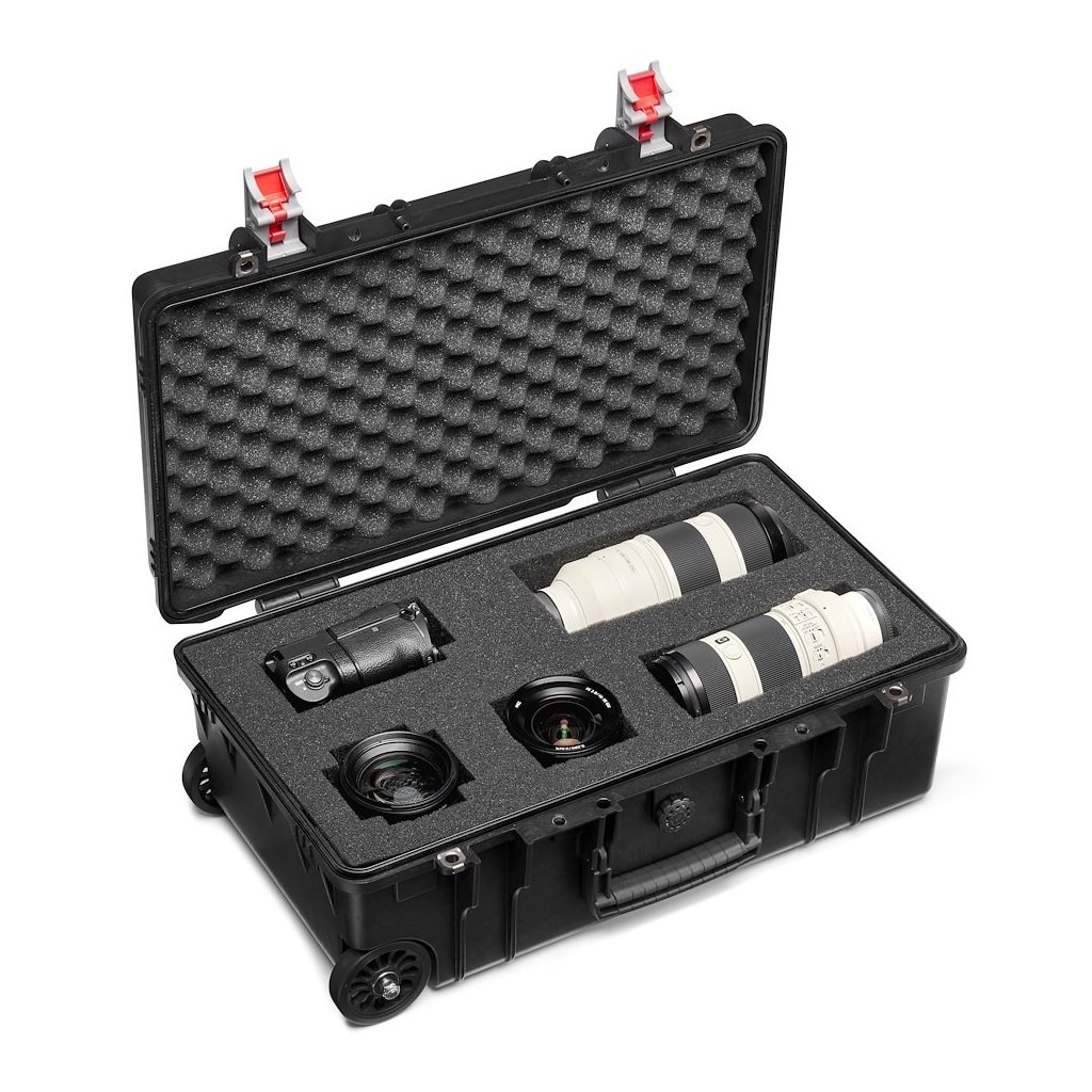 They are IP67 tested meaning that there is no ingress of dust and withstands temporary immersion in water for 30 minutes. Manufactured and designed in Italy, the Tough H-55 is ideal for travellers who do not want to compromise between safety and portability. This case fits airline carry-on size restrictions* and is provided with a two stage telescopic handle with self-locking system to prevent unwanted opening when carrying and transporting, and the automatic pressure release valve provides automatic regulation of the interior air pressure when on a flight. The two wheels have a larger diameter, silent and stable during transport, giving optimal stability, strength, and made to be durable to last over time. The new PRO Light Reloader Tough H-55 is provided with 4 layers of pre-cubed foam and convoluted foam for the lid. The convoluted foam in the lid helps to firmly keep the stored equipment when the case is closed. The 4 layers of pre-cubed foam allows you to customize the insert to your own indsividual equipment and the four layers help for an easier initial setup and arrangement. The Tough H-55 features exclusive design functions that make it compatible with Manfrotto Tough Modular accessories. Four metal pins allow you to easily attach Tough Tripod bag and laptop bag (sold separately) for a more modular carrying experience.