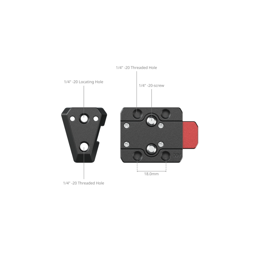 The V-Lock mount attaches to cages or handles with two 1/4"-20 threaded holes spaced 18mm apart, while the V-Lock plate features both a 1/4"-20 threaded hole and a 1/4"-20 locating hole. Together, they enable snap-in mounting and auto-locking for efficient setup and teardown. Made from durable aluminum alloy and stainless steel, the kit is lightweight and portable, ideal for on-the-go filming.