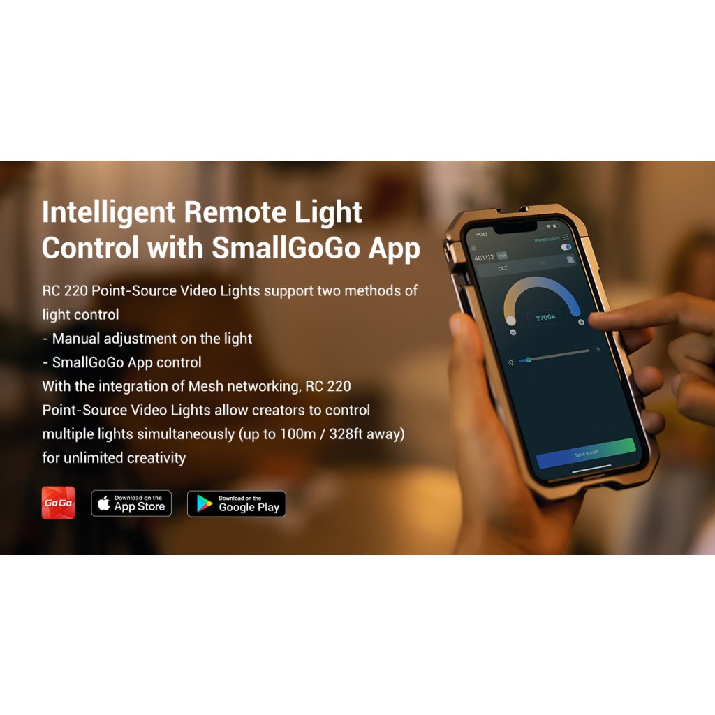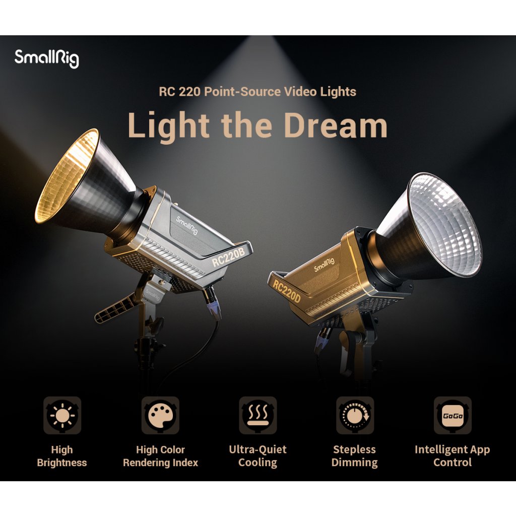 SmallRig RC220D (3618) is the first generation point-source LED light from SmallRig. With the latest COB technology and SmallRig's industrial design excellence, the RC220D is unique: it offers a high-reflectance hyper reflector, at a distance of 1 meter, the center illuminance reaches 98,700 lux, far beyond the same level of products on the market. The reflector also offers high color fidelity (CRI 95+, TLCI 96+), standard Bowens mount, 9 built-in light effects (Paparazzi, Firework, Lightning, Fault Bulb, TV, Breath, Flash, Party, Flame), remotely controlled brightness using SmallGoGo app. RC220B has a color temperature of 5600K (+/- 200K) and 98,700 lux illumination (with reflector).