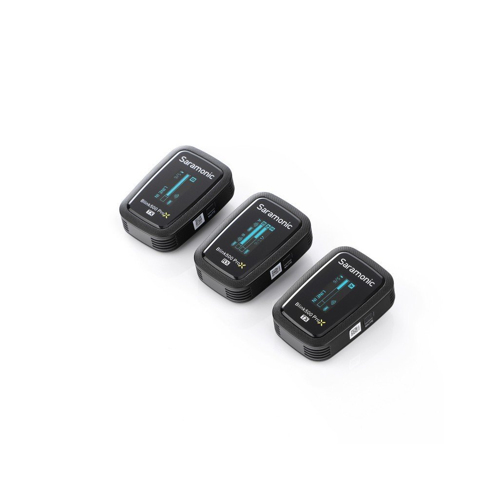 Saramonic Blink500 ProX B2 Wireless Audio Transmission Kit The Saramonic Blink500 ProX B2 Wireless Audio Transmission Kit is an ideal choice for vloggers, journalists, youtubers, tiktokers and web creators. It includes 2 transmitters, a receiver, a unique charging case and additional tie microphones. It's everything you need to ensure professional quality recordings. You will connect the receiver to cameras, camcorders, audio recorders or smartphones equipped with a 3.5mm mini jack. Small microports with large LCD screens will provide a transmission range of 100 meters. The set is distinguished by ultra-low latency and an excellent signal-to-noise ratio. You can easily charge the microports with the help of a protective case. Main Product Features wireless audio transmission kit with 1 receiver and 2 transmitters excellent quality of recorded sound (signal-to-noise ratio - 84 dB, sampling - 48 kHz, frequency response - 20 Hz - 20 KHz) Lightweight and ergonomic charging case that allows you to refill all microports simultaneously recording clear and crisp sound with barely audible background noise larger OLED display for even better recording control 2 compact and ultra-lightweight transmitters with built-in microphones and clips for attaching to clothing compatible with devices equipped with a 3.5mm mini jack socket (TRS and TRRS) up to 100 meters range guarantees even more convenient work ideal for, among other things, recording audio with cameras, camcorders, recorders and smartphones impressively low latency of 8 ms possibility to record audio in STEREO and MONO modes perfect adaptation to the needs of recording - 6 levels of signal amplification ("gain") possibility to connect headphones to the receiver and monitor audio in real time included 2 high-quality tie microphones that can be connected to the transmitters via MIC / LINE IN input possibility to power devices via USB-C port (e.g., from a power bank) up to 10 hours of operation on a single charge etui provides two full charges for all microports included automatic activation of microports when the Blink500 ProX B2 BOX charging case is opened an excellent choice for youtubers, vloggers, tiktokers, web creators and journalists possibility to connect the receiver to devices equipped with Lightning and USB-C ports (requires purchase of compatible cables) Professional sound quality Each Blink500 ProX TX transmitter offers a built-in omnidirectional condenser microphone. The signal-to-noise ratio here is 84 dB, the sampling frequency is 48 KHz, and the frequency response is 20-20 KHz. Such parameters allow recording clear and crisp sound with almost inaudible background noise. 100-meter range The signal range offered by the Saramonic Blink500 ProX B2 wireless audio transmission kit is 100 meters. This allows the people being recorded to move freely with the microports over a large area, and high-quality audio will be recorded without any interference. Lag-free sound The Saramonic Blink500 ProX B2 kit features an impressively low latency of just 8ms. This is great news for those who want to use microports when broadcasting online and be sure that no audio lag will occur during recordings! Dozens of applications The Saramonic Blink500 ProX B2 is a versatile wireless audio transmission kit consisting of a receiver, 2 transmitters, a case that acts as a charging station, and necessary accessories. The ultralight microports are perfect for shooting interviews, reports, vlogs, live broadcasts, webinars, remote lectures or filming weddings. Sets of devices The Blink500 ProX RX receiver allows you to use a TRS or TRRS output cable to connect to DSLR cameras, mirrorless cameras, audio recorders and mixers, smartphones, tablets and computers equipped with a 3.5mm input. With the purchase of the appropriate cable, the Saramonic Blink500 ProX B2 wireless audio kit can also become compatible with USB-C and Lightning ports. 10 hours of continuous operation A fully charged Saramonic Blink500 ProX B2 wireless audio kit will provide 10 hours of uninterrupted audio work. You will successfully record several episodes of your YouTube show, complete a long interview or a full-day report in this time. Unique charging case Although microports can be successfully charged via USB-C ports, you'll find something much better in the Saramonic Blink500 ProX B2 kit. The special Blink500 ProX B2 BOX charging case will provide adequate protection for all your devices, while allowing you to replenish your microports. The fully charged case guarantees 2 full charges for the receiver and transmitters! One-shot is enough! The microports included in the Saramonic Blink500 ProX B2 wireless audio kit feature large backlit screens. Controlling the settings is thus even more convenient! On the display you will check such parameters as battery charge, signal gain level, range and connectivity status, among others. Additional microphones included You will also find high-quality tie microphones in the kit. This will be an ideal choice for those who care about keeping the transmitters out of the frame. This solution will allow you to record sound even closer to the people speaking. Even more possibilities When recording audio with the Saramonic Blink500 ProX B2 set, you can switch between STEREO and MONO modes independently. If necessary, you can quickly and conveniently split tracks into separate channels. The transmitters and receiver are also equipped with "mute" buttons. With their help, you can mute the recorded sound in a second. Precise control of recordings The Blink500 ProX RX receiver is equipped with a 3.5mm mini jack socket, which will allow you to conveniently connect headphones. Monitoring recorded interviews, conversations and speeches will enable you to effectively catch crackles, noises or other unwanted sounds. It will also be a great way to eliminate mistakes or slips of the tongue. Always-on-your-place The light weight of the Blink500 ProX TX transmitters wil