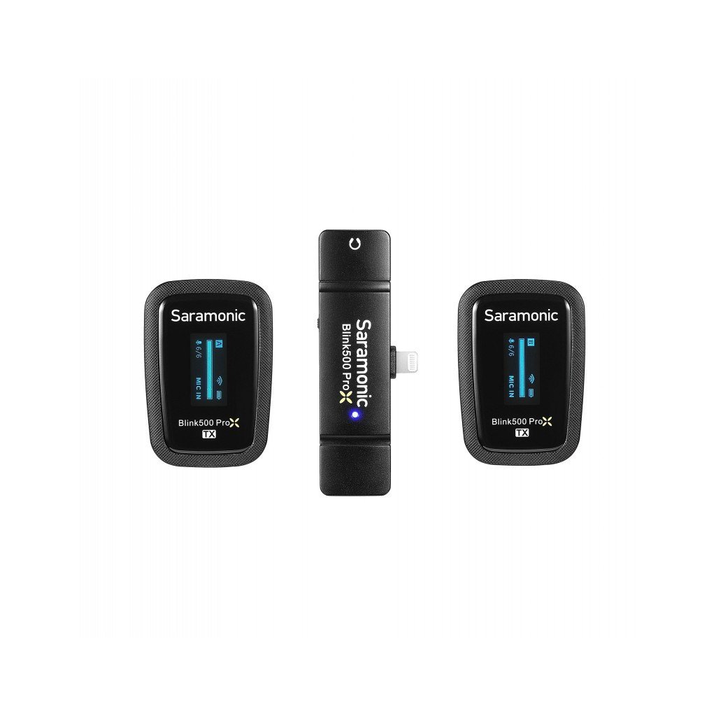 The Saramonic ProX B4 Wireless Audio Transmitter Kit (RXDi + TX + TX) is the perfect choice for vloggers, journalists, youtubers, tiktokers and web developers who work with devices from Apple. In the box you'll find a receiver that connects to your iPad or iPhone with Lightning connector, 2 transmitters, a unique charging case, tie microphones and additional accessories. It's everything you need to ensure professional quality recordings. Small microports with large LCD screens will provide a transmission range of 100 meters. The set is distinguished by ultra-low latency and excellent signal-to-noise ratio. You can easily charge the microports with the help of a protective case. Main Product Features wireless audio transmission kit with 1 receiver and 2 transmitters compatible with Apple devices equipped with Lightning port ideal for use with iPhones and iPads excellent quality of recorded sound (signal-to-noise ratio - 84 dB, sampling - 48 kHz, frequency response - 20Hz - 20 KHz) a great choice for youtubers, vloggers, tiktokers, web creators and journalists lightweight and ergonomic charging case that allows you to refill the transmitters receiver powered directly from iPhone / iPad larger OLED displays in the transmitters for even better control of recordings enables recording of clear and crisp audio with barely audible background noise compact and ultra-lightweight transmitters with built-in microphones and clips for attaching to clothing also includes tie microphones that can be connected to the transmitters via MIC / LINE IN input up to 100 meters range is a guarantee of even more convenient work impressively low latency of 8 ms possibility to record audio in STEREO and MONO mode perfect adaptation to the needs of recording - 6 levels of signal amplification ("gain") possibility to connect headphones to the receiver and monitor audio in real time possibility to power the transmitters via USB-C ports (e.g. from a power bank) up to 10 hours of operation on a single charge etui provides 2 full charges for transmitters For Apple equipment users The Saramonic Blink500 ProX B4 Wireless Audio Transmitter Kit (RXDi + TX + TX) was created specifically for users of equipment from Apple. The Lightning plug used in the receiver will easily connect to your iPhone or iPad, even if the device is in an armored case! Dozens of applications The Saramonic Blink500 ProX B4 (RXDi + TX + TX) is a versatile wireless audio transmission kit consisting of a receiver, 2 transmitters, a case that acts as a charging station, and necessary accessories. The ultralight microports are perfect for shooting interviews, reports, vlogs, live broadcasts, webinars, remote lectures or filming weddings. Unique charging case Although microports can be successfully charged via USB-C ports, you'll find something much better in the Saramonic Blink500 ProX B4 (RXDi + TX + TX) kit. The special Blink500 ProX B4/6 BOX charging case will provide adequate protection for all your devices, while allowing you to replenish the power in your transmitters. A fully charged case guarantees 2.5 microport charges. The receiver is powered directly from an iPhone or iPad. Professional sound quality Each Blink500 ProX TX transmitter offers a built-in omnidirectional condenser microphone. The signal-to-noise ratio here is 84 dB, the sampling frequency is 48 KHz, and the frequency response is 20-20 KHz. Such parameters allow recording clear and crisp sound with almost inaudible background noise. 100-meter range The signal range offered by the Saramonic Blink500 ProX B4 (RXDi + TX + TX) wireless audio transmission kit is 100 meters. This allows the people being recorded to move freely with the microports over a large area, and high-quality audio will be recorded on an iPhone or iPad without any interference. Lag-free sound The Saramonic Blink500 ProX B4 (RXDi + TX + TX) kit features an impressively low latency of just 8ms. This is great news for those who want to use microports during online broadcasts and be sure that no audio lag will occur during recordings! Even more possibilities When recording audio with the Saramonic Blink500 ProX B4 (RXDi + TX + TX) kit, you can independently switch between STEREO and MONO modes. If necessary, you will quickly and conveniently split the tracks into separate channels. The transmitters are also equipped with "mute" buttons. With their help you will mute the recorded sound in a second. Precise control of recordings The Blink500 ProX RXDi receiver is equipped with a 3.5mm mini jack socket, which will allow you to conveniently connect headphones. Monitoring recorded interviews, conversations and speeches will enable you to effectively catch crackles, noises or other unwanted sounds. It will also be a great way to eliminate mistakes or slips of the tongue. 10 hours of continuous operation A fully charged Saramonic Blink500 ProX B4 (RXDi + TX + TX) wireless audio kit will provide 10 hours of uninterrupted audio work. You will successfully record several episodes of your YouTube show, complete a long interview or a full-day report in this time. One-shot is enough! The transmitters included in the Saramonic Blink500 ProX B4 wireless audio kit (RXDi + TX + TX) are equipped with large backlit screens. Controlling the settings is thus even more convenient! On the display you will check such parameters as battery charge, signal gain level, range and connectivity status, among others. Additional microphones included You will also find high-quality tie microphones in the kit. This will be an ideal choice for those who care about keeping the transmitters out of the frame. This solution will allow you to record sound even closer to the people speaking. Always-on-your-place The light weight of the Blink500 ProX TX transmitters will make you forget their presence more than once. You can easily clip them to your shirts, blouses or jackets, using a special clip. Using such a solution gives you the assurance that the microports