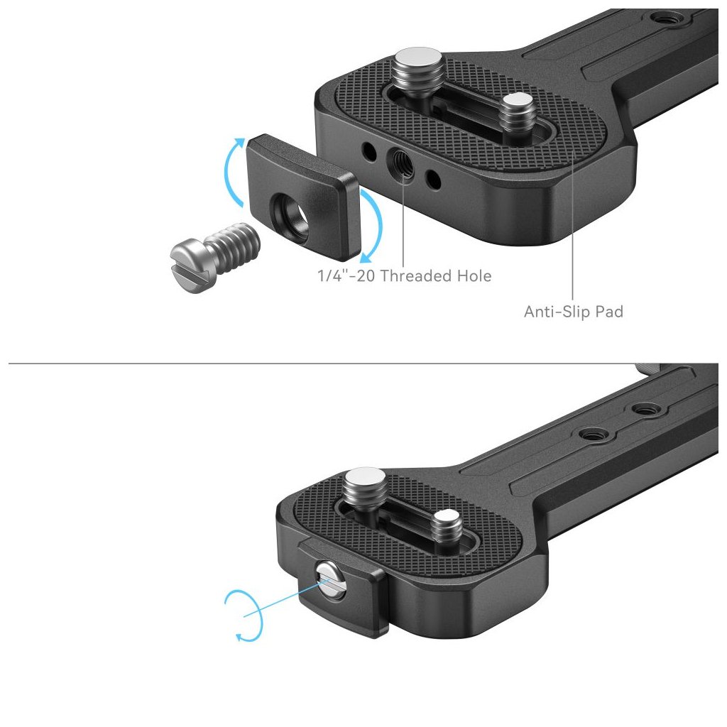 Featuring multiple 1/4" -20, ARRI 3/8" -16 threads and a cold shoe for accessory attachment, such as the original gimbal tripod, camera plate, and Monitor Mount 2346. The handle can be configured for right or left hand based on your needs. A flat head screwdriver is included to secure the handle screw and stores on the bottom.