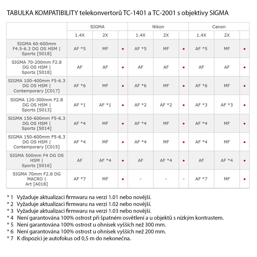 Telekonvertor SIGMA 1.4x novej generácie SGV je kompatibilný s vybranými objektívmi SIGMA radov Art, Sports a Contemporary. Telekonvertor obsahuje SLD (Special Low Dispersion) optické členy pre korekciu chromatickej aberácie. Automatické ostrenie je účinné až do clony F8. Celá konštrukcia je odolná proti striekajúcej vode a prachu. Technické parametre: - optická skladba: 7 šošoviek v 5 skupinách - zväčšenie ohniskovej vzdialenosti: 1,4x - rozmery: 69.8 mm x 25.0 mm - hmotnosť: 190 g - utesnenie vlhkosť / prach: ánoDodatočné parametre