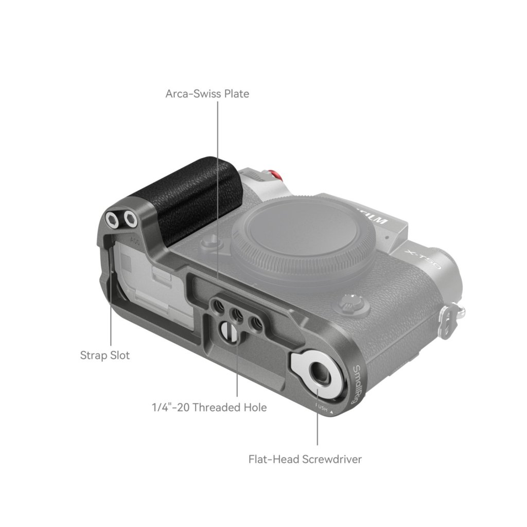 SmallRig Silicone L-Shape Grip for FUJIFILM X-T50 (Charcoal Silver) 4712 is designed to improve the camera grip. The L-Shape Grip mounts to the camera with a 1/4"-20 screw at the bottom, and the built-in silicone pads prevent scratches. The texture and color of the grip perfectly match with FUJIFILM X-T50. The built-in Arca-Swiss quick-release baseplate allows for easy and fast Arca-type tripod assembly and disassembly. Four 1/4"-20 threaded holes at the bottom to attach Manfrotto-type plates and tripods. Strap slot for Wrist Strap (ID: 3848). The built-in flat wrench on the bottom for easy accessory assembly and disassembly. The grip comes with the exclusive hot shoe cover imprinted with the “FUJIFILM” sound wave and the year of foundation as our tribute to FUJIFILM. It also comes with a shutter release button to ensure a soft and comfortable finger touch.