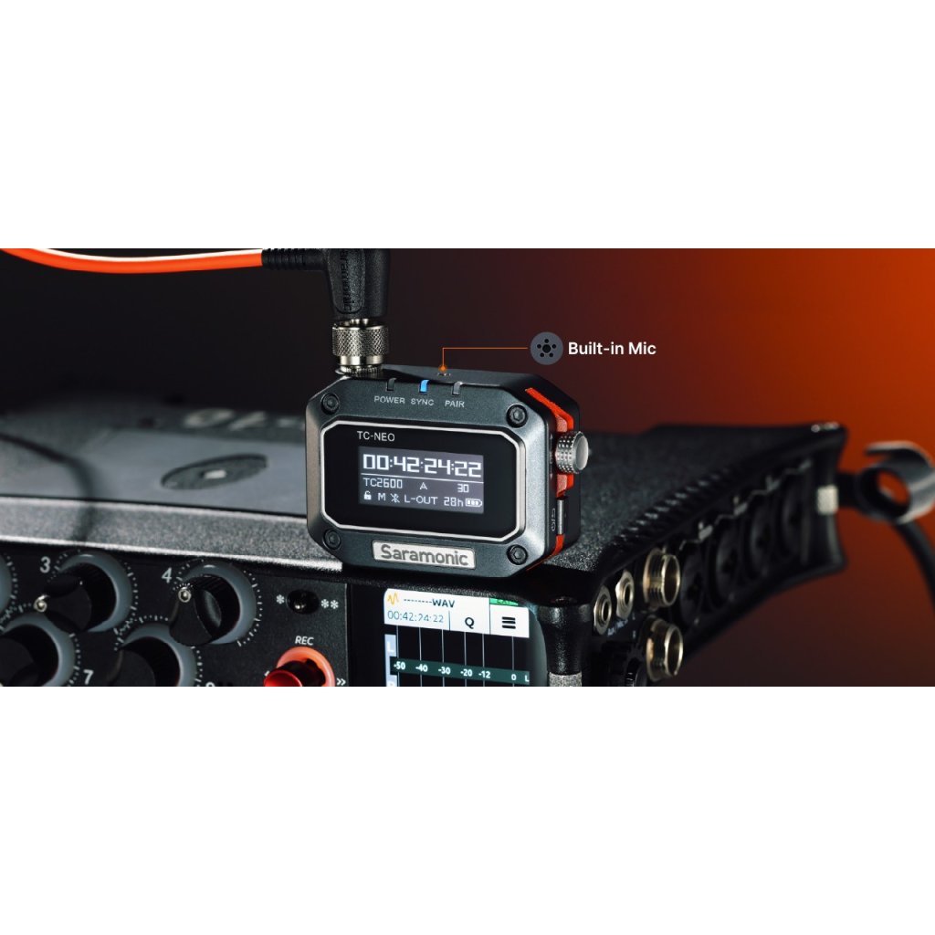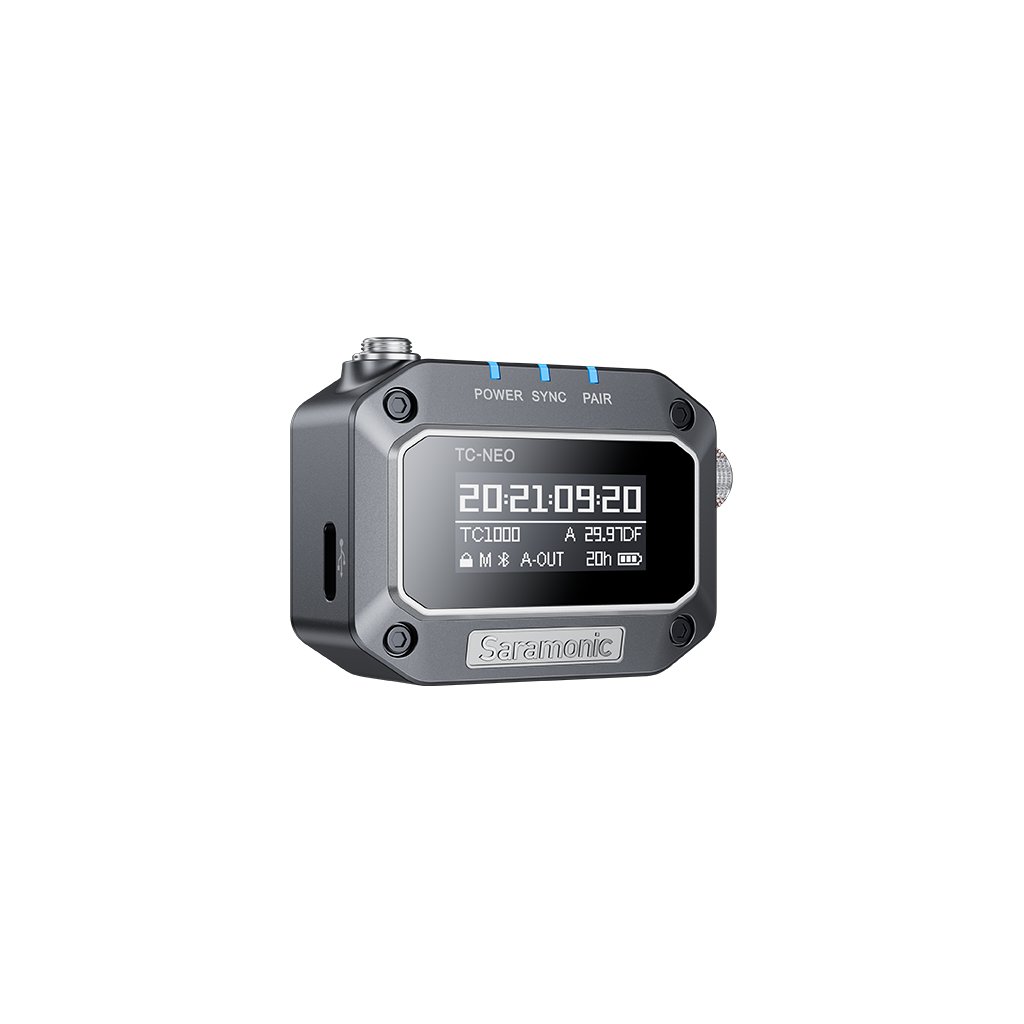 The Saramonic TC-NEO is a professional wireless timecode generator designed for precise and reliable sync. It features a high-precision TCXO with ±0.5 ppm accuracy for minimal drift, multiple sync methods including Bluetooth and 2.4 GHz, and a long 22-hour battery life for all-day shoots.