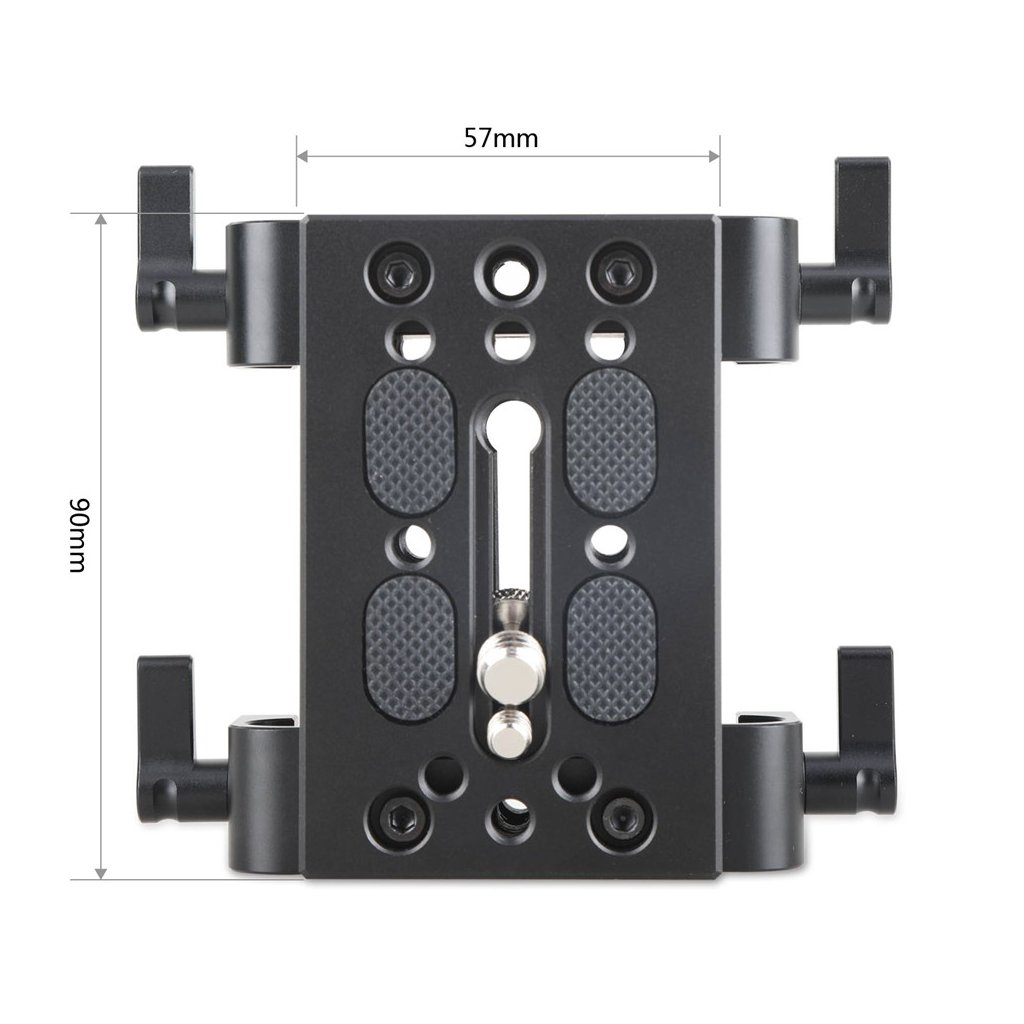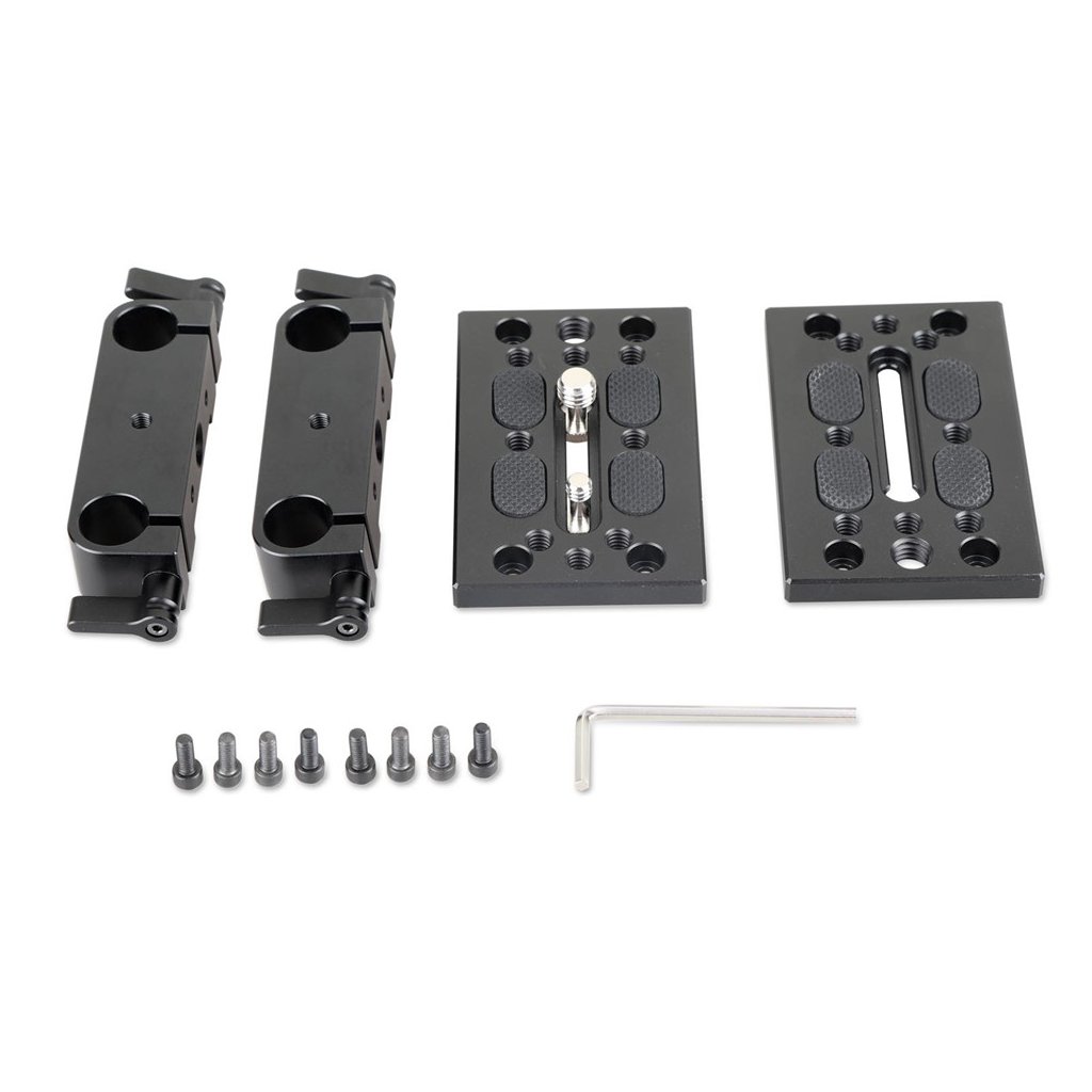 SmallRig Tripod Mounting Kit W/15mm Rail Block 1798 is combined by two SmallRig Tripod mounting plate w/15mm rail block. Used for long length, front heavy, camera packages. Attach it to the tripod plate with a 3/8''-16 screw and 1/4''-20 screw, then you can mount your dovetail base plate on it. It clamps onto 15mm rails for accessories attachment, such as follow focus, matte box, etc. The 40mm groove makes it possible to balance a front heavy camera on your tripod properly.