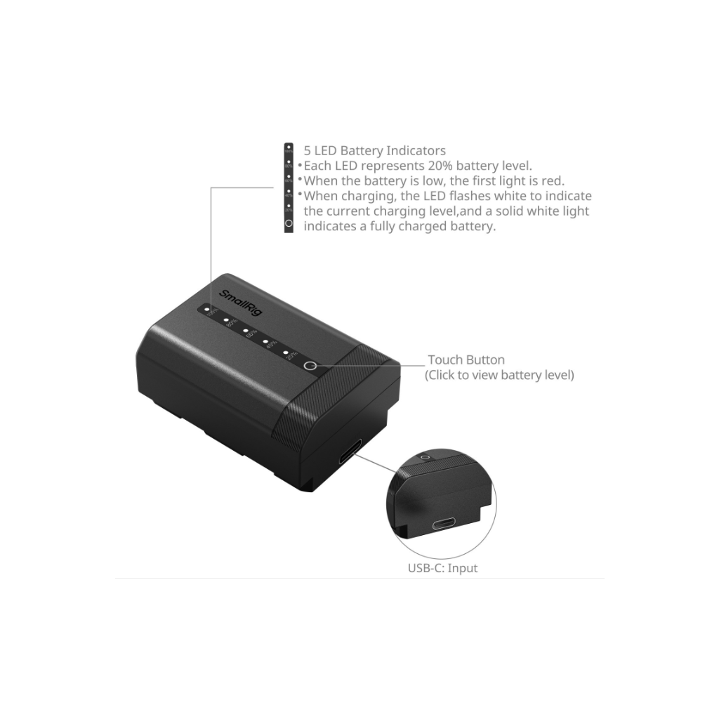 Keep your Sony camera powered for extended shoots with the SmallRig USB-C Camera Battery for Sony NP-FZ100 5297. Designed for professional use, this high-capacity 2600mAh battery features 5 LED indicators for real-time power monitoring, including a red warning light to alert users to low battery levels.