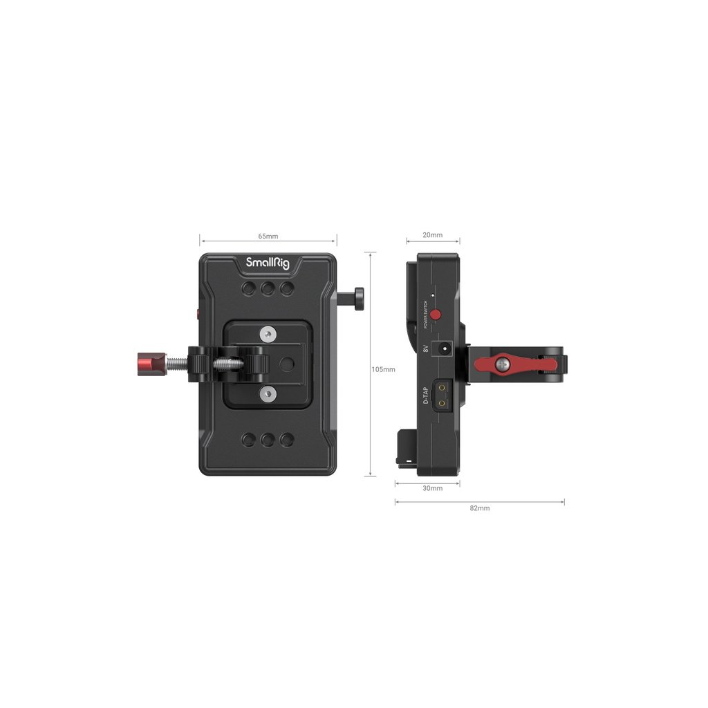 SmallRig V Mount Battery Adapter Plate (Basic Version) with Crab-Shaped Clamp 3497 is designed to provide greater battery life to your camera rig via a V mount battery. Its standard quick-lock V mount supports most V mount batteries. Output ports, including an 8V DC port, a 12V DC port, and two 14.8V D-Tap ports, work with a V mount battery to power your camera and other equipment (e.g. monitor, transmitter, follow focus, mobile phone, etc.). It features a power switch that controls all of the output ports more quickly and conveniently and comes with a super clamp mount that fits rod diameter from 15mm to 30mm to help mount a V mount battery to a tripod, a light stand, or a handheld ring for gimbals. In addition, multiple 1/4”-20 thread holes allow attaching other accessories such as dual rod clamp and magic arm.