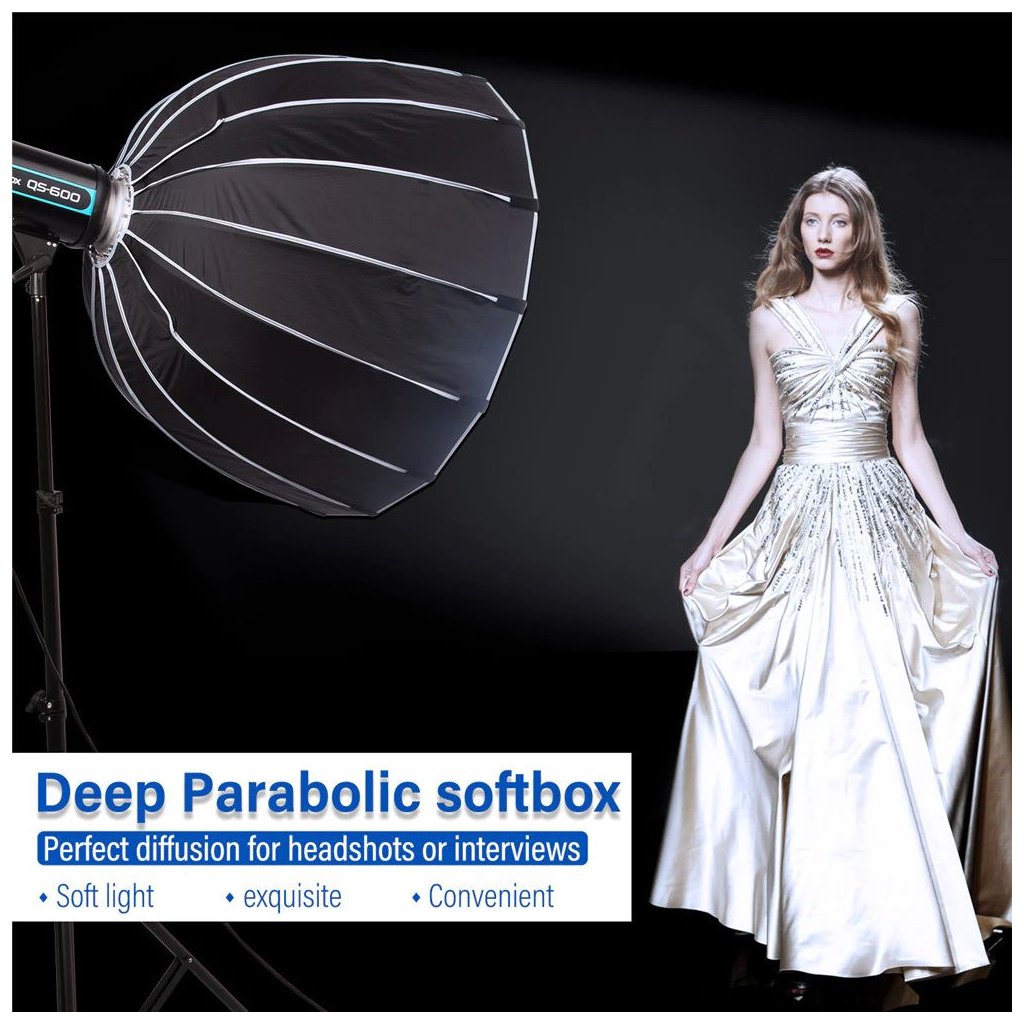 Softbox for Viltrox Weeylite Ninja 400 LED spotlight (and others with Bowens bayonet e.g. Sokani x60/Godox SL-60W VL150/Aputure 1202). Diameter 90 cm, depth 62 cm, weight 2,2 kg. Package includes carrying bag and honeycomb filter.