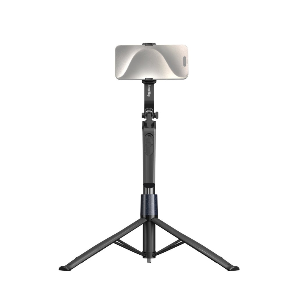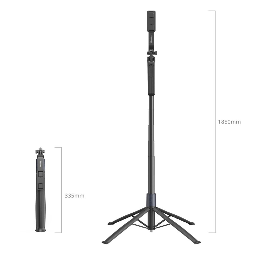 SmallRig Windproof Live Broadcast Stabilizer Stand Encore PT60 4668. The working height ranges from 0.35 to 1.85 meters. The Stabilizer Stand features a unique ground nail design that provides stability for outdoor shooting on rugged terrain, while its extended four-corner support ensures stability on urban surfaces and enhances grip comfort. This product supports adjustable tilt angles, allowing for 360° rotation. The gear structure of the head features a built-in 1/4”-20 screw, ensuring stability and durability. It securely holds various smartphones using a clamp-style method, compatible with phone sizes ranging from 65mm to 97mm. Bluetooth control range of 10m. A 360° rotatable handheld support arm that enhances user experience during device movement and control.