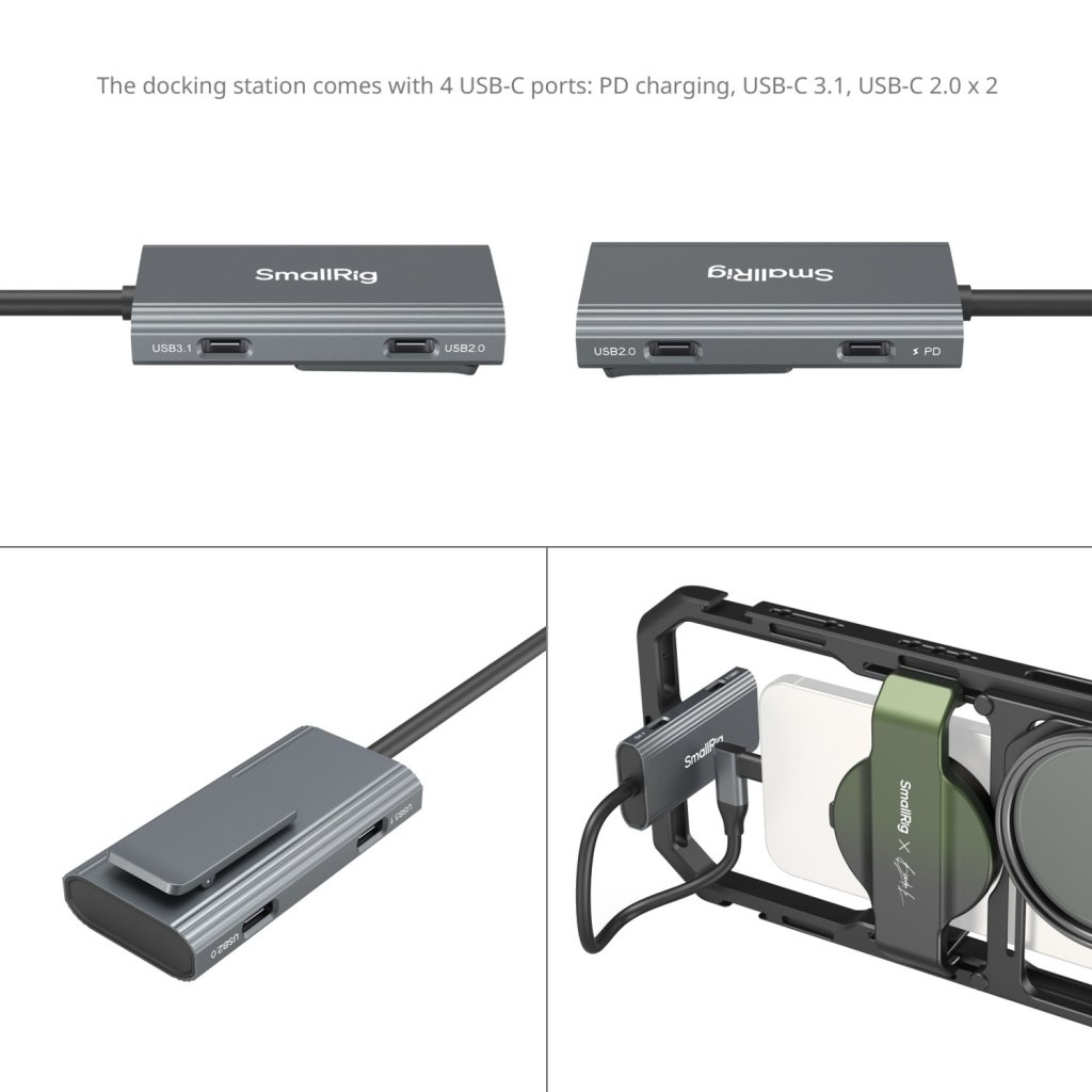 SmallRig x Brandon Li All-in-One Mobile Video Kit Full Quick Release Co-design Edition 4596 is the perfect one-stop solution for professional smartphone video shooting. The kit includes a universal mobile phone cage, a rotatable side handle with M.2 SSD enclosure and wireless remote controller, a 67mm universal filter adapter, a magnetic 67mm VND 2-32 (1-5 Stop), a 4-In-1 USB-C docking station, an Arca-Swiss quick release adapter, a power bank holder, and other accessories. The universal cage supports 67mm magnetic filters, providing anti-glare solutions for most mobile phones and reducing filter light leakage. The rotatable side handle with wireless control integrates multiple functions and features an enclosure for M.2 SSD to support direct external recording. The detachable wireless control enables remote shooting, focusing, and zooming in/out. Stepless rotation of the handle adapter allows instant switching between the side and top handle modes, while the quick release mechanism on both sides enables swift, tool-free assembly and adjustment. Also, the kit comes with an Arca-Swiss quick-release adapter, supporting quick attachment to the cage and professional tripods. The cage kit provides multiple standard 1/4"-20 threaded holes and cold shoe mounts, supporting the free combination of accessories, and providing more possibilities for shooting. The 4-in-1 USB-C docking station offers a high-power PD 100W charging port, a USB-C 3.1 port, and two USB-C 2.0 ports. When used for mobile videography, it enables simultaneous charging, ProRes video storing, and utilization of a USB-C microphone.
